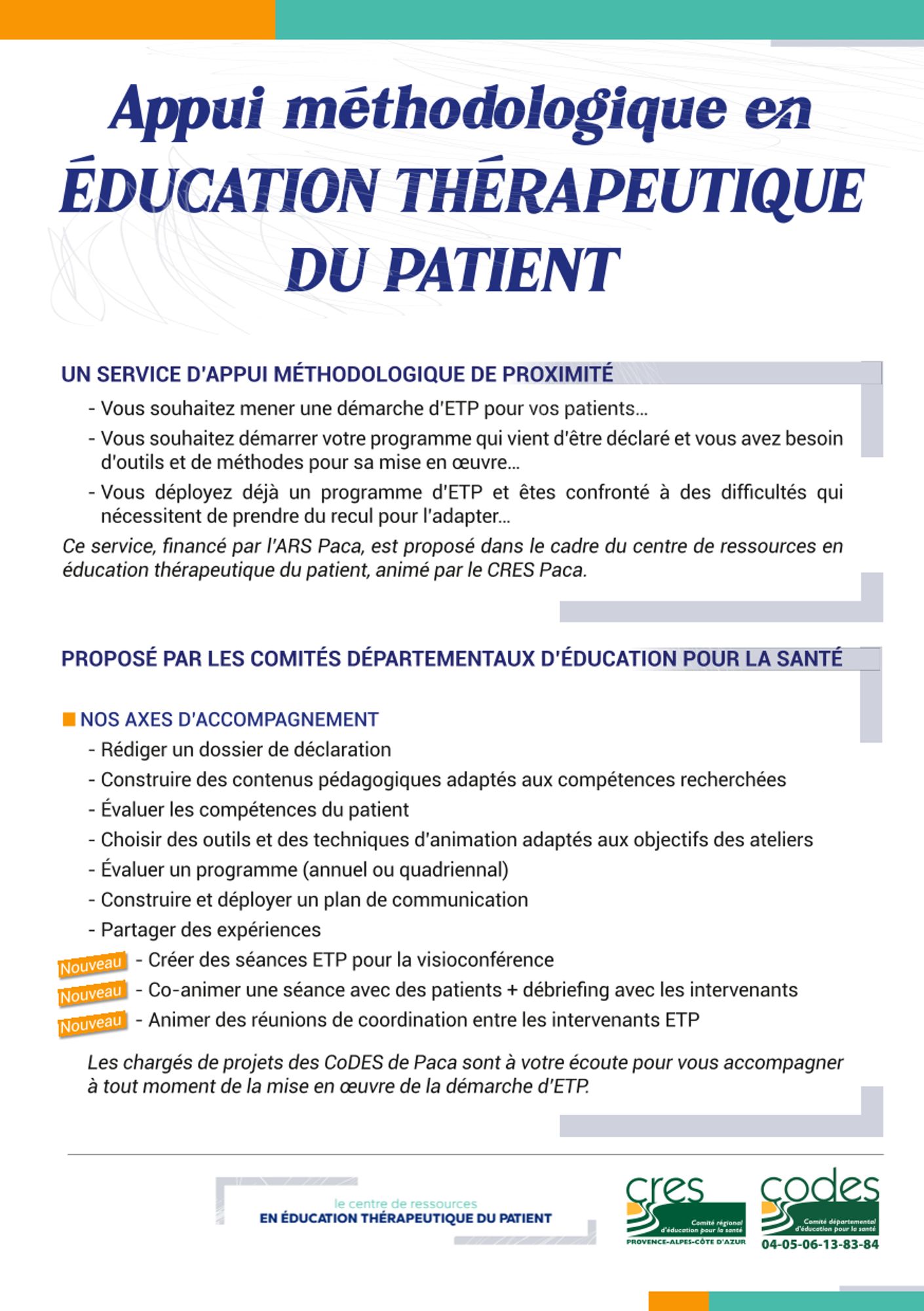 Dans le cadre de ses missions socles, soutenues par l'ARS PACA, le CoDES 05, en lien avec le Centre Ressources en Education Thérapeutique du Patient porté par le CRES Provence Alpes Côte s'Azur, propose un soutien aux structures déployant ou souhaitant déployer des programmes d'Education Thérapeutique du Patient.