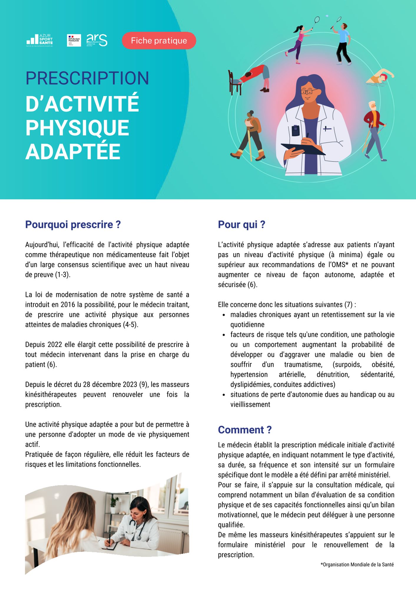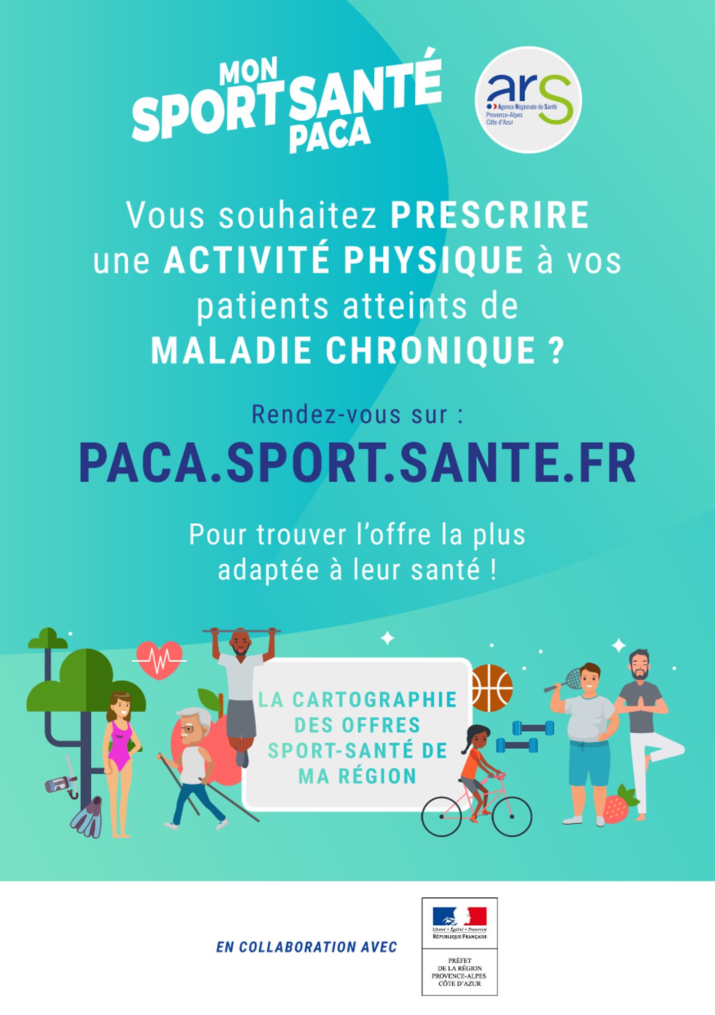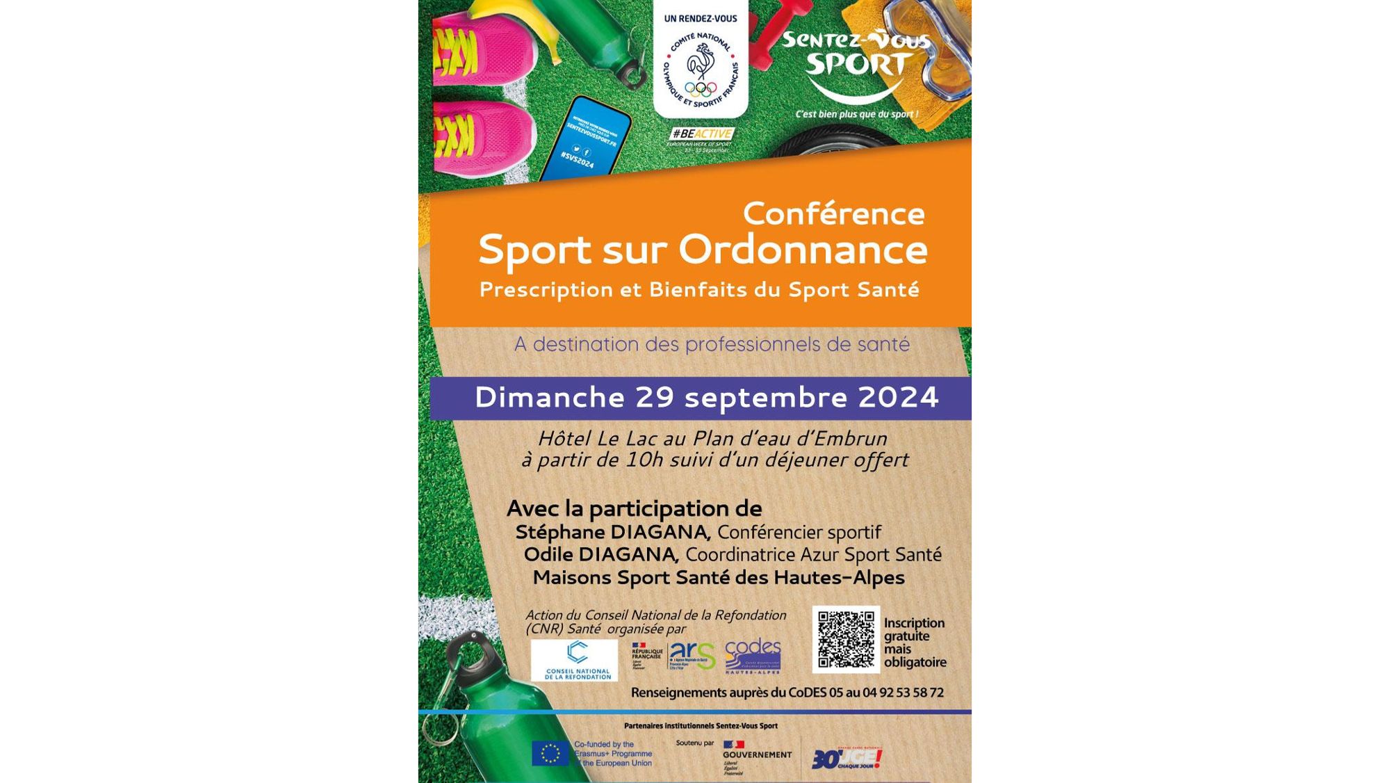 Dossier documentaire de la conférence "Sport sur Ordonnance : prescription et bienfaits du Sport Santé" Dimanche 29 septembre 2024 Présentation des intervenants (12.8 Mo) Documents à télécharger Brochure des Maison Sport Santé des Hautes-Alpes (988.4 Ko) Mon Sport Santé Paca (203.8 Ko) Fiche Prescription d'Activité Physique Adaptée - Azur Sport Santé / ARS PACA (5.4 Mo) Recommandations de l'Activité Physique - Azur Sport Santé (7.2 Mo) Prescrire et orienter le patient - Assurance Maladie (272.1 Ko) Affiche Sédentarité VS Activité physique - ONAPS (3.5 Mo) ACTIVITÉ PHYSIQUE ET SÉDENTARITÉ DANS LA POPULATION EN FRANCE - Santé Publique France (1.2 Mo) Sites internet Azur Sport Santé Mon Sport Santé Paca Maison Sport Santé du Briançonnais - Fondation Edith Seltzer Maison Sport Santé d'Embrun - Le Dalhir Maison Sport Santé du Chamspaur Valgaudemar - CPTS Champsaur Valgaudemar Maison Sport Santé du Laragnais - Centre Athena ONAPS - Observatoire Nationale de l'Activité Physique et de la Sadentarité