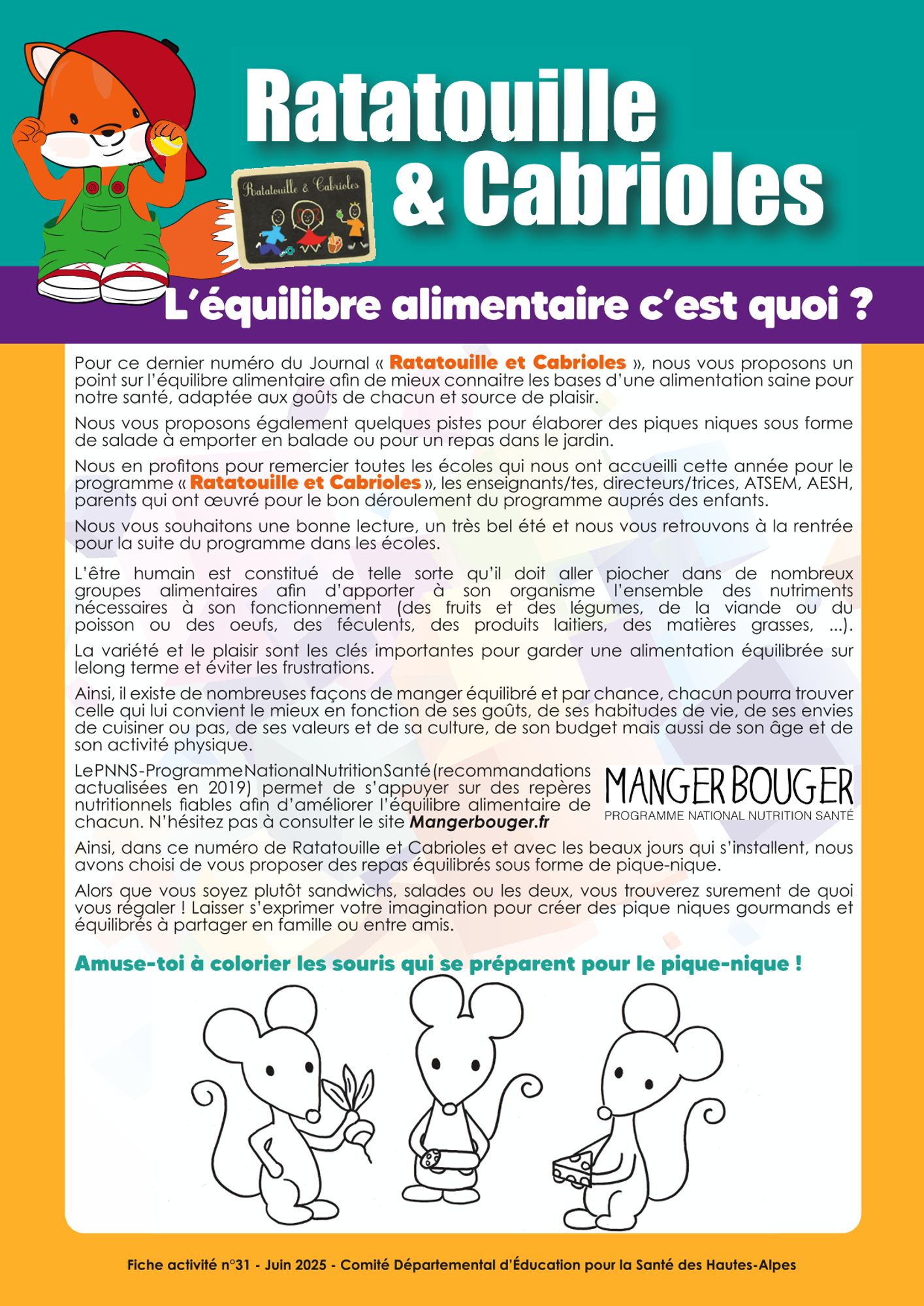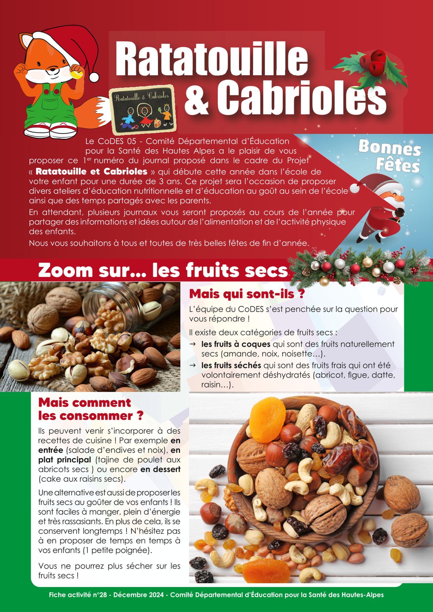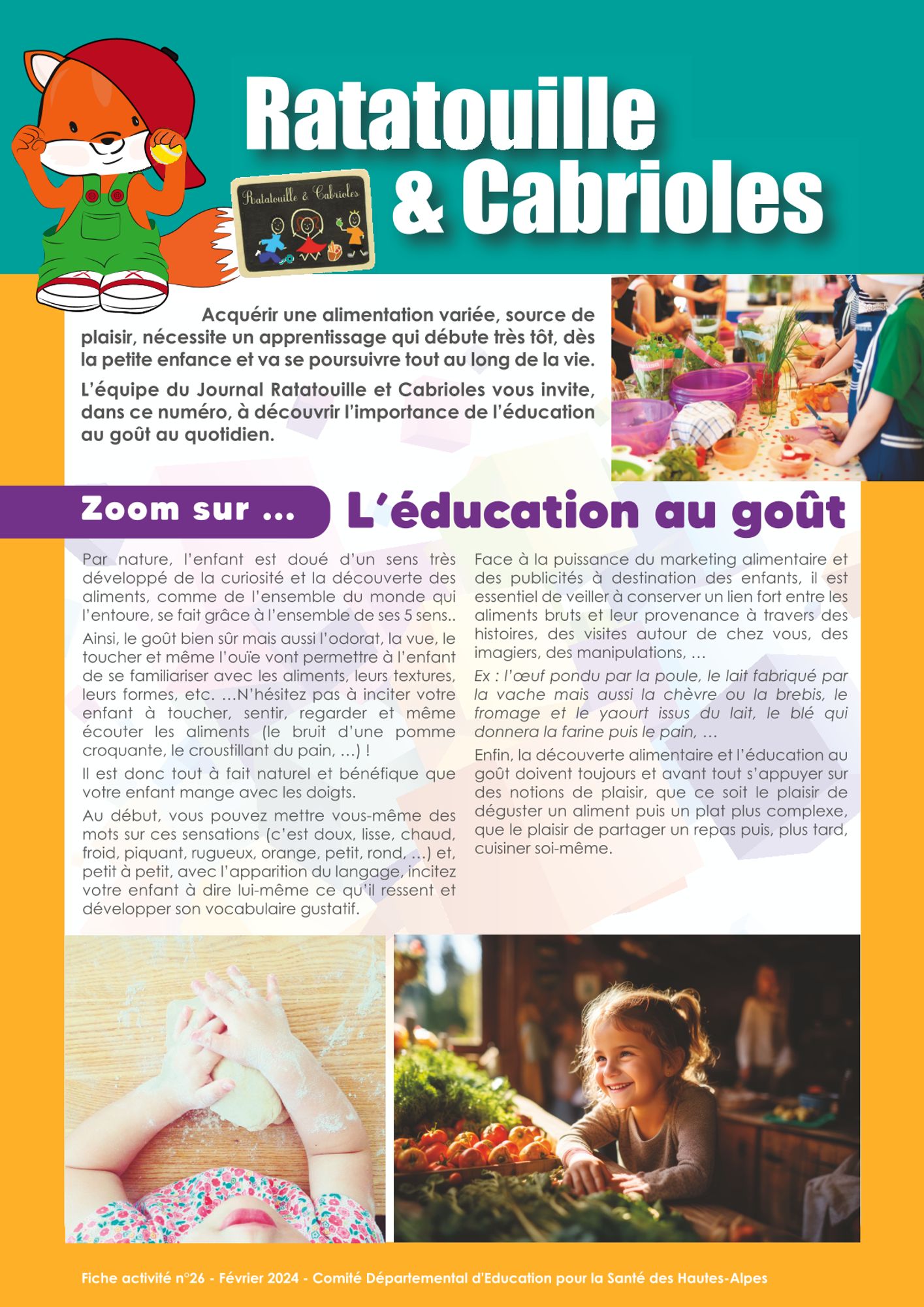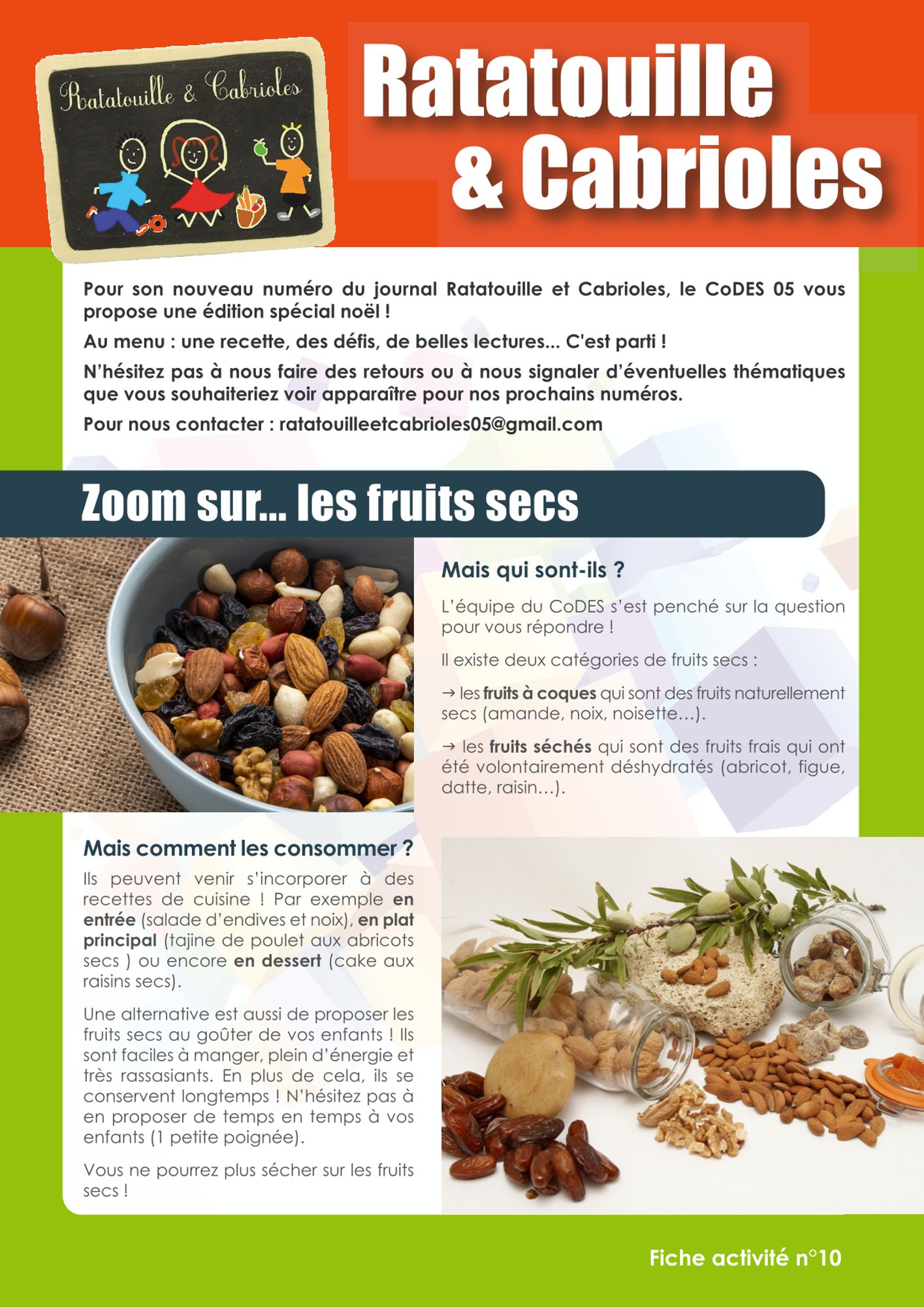 Depuis mars 2020, date du premier confinement, l'équipe du CoDES 05 a proposé un journal ludique sur la nutrition à destination des élèves de maternelle, des parents et des enseignants. Dans chaque numéro, les familles peuvent découvrir un ensemble d'activités en lien avec la nutrition (recettes, défis, comptines, albums jeunesse, idées d’activité physique, …).