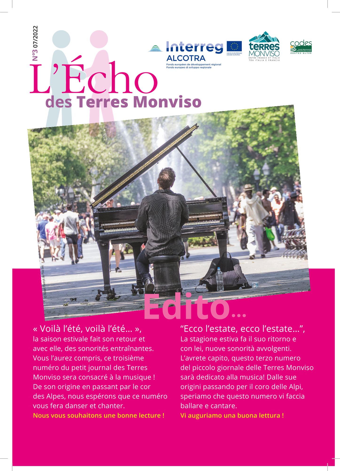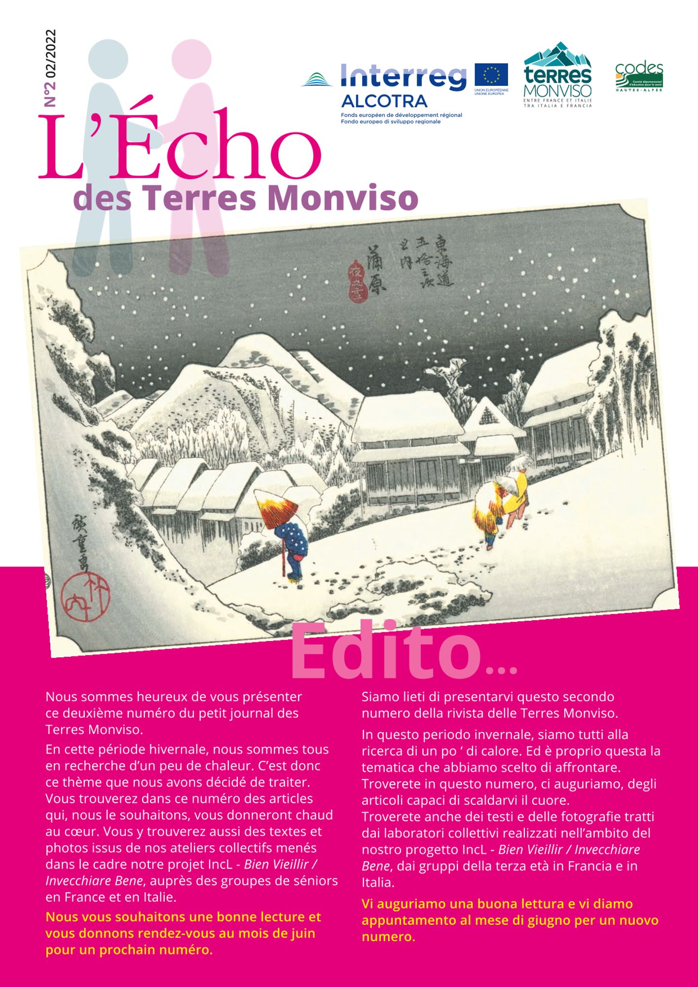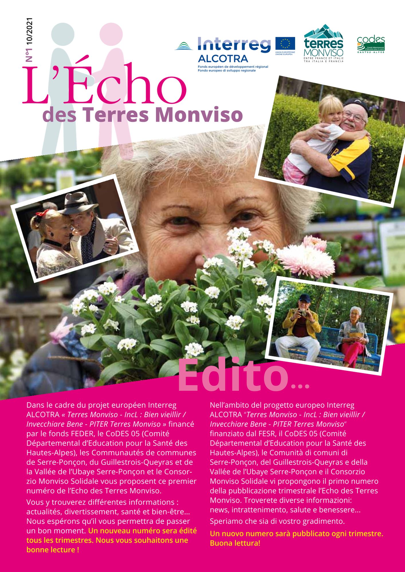 Dans le cadre du projet européen Interreg ALCOTRA « Terres Monviso - IncL : Bien vieillir / Invecchiare Bene - PITER Terres Monviso » financé par le fonds FEDER, le CoDES 05 (Comité Départemental d’Education pour la Santé des Hautes-Alpes), les Communautés de communes de Serre-Ponçon, du Guillestrois-Queyras et de la Vallée de l’Ubaye Serre-Ponçon et le Consorzio Monviso Solidale vous proposent ce premier numéro de l’Echo des Terres Monviso. Vous y trouverez différentes informations : actualités, divertissement, santé et bien-être… Nous espérons qu’il vous permettra de passer un bon moment.