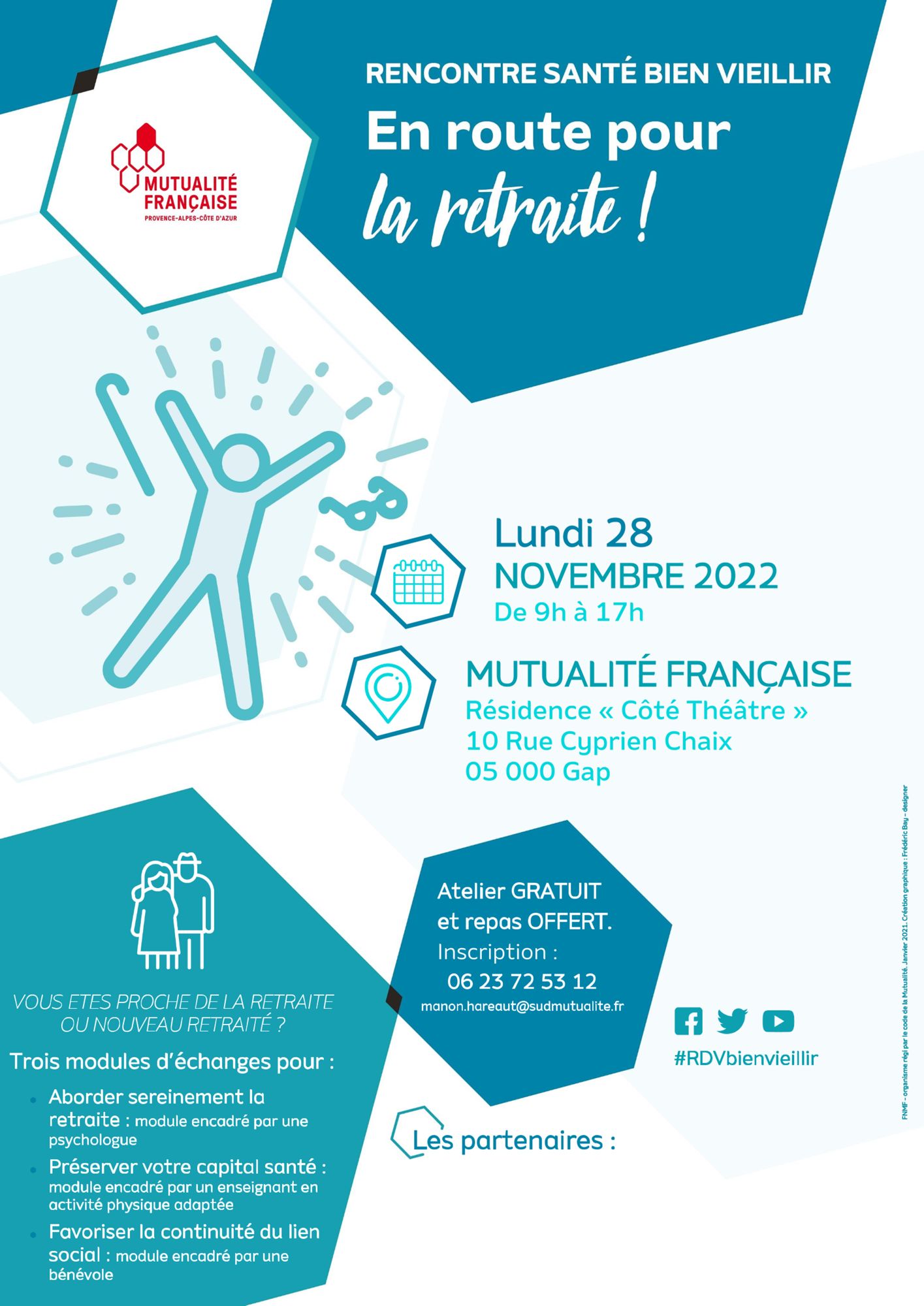 Afin d’accompagner les futurs et jeunes retraités, à plus ou moins deux ans de la retraite, la Mutualité Française Sud propose une rencontre santé « Bien vieillir, en route pour la retraite » sur la journée du lundi 28 novembre 2022, organisée en 3 modules ;