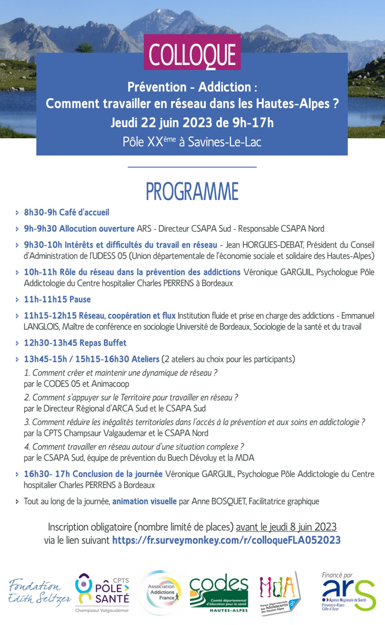 Les partenaires du projet Plan d'actions coordonnées de lutte contre les addictions dans les Hautes-Alpes sont heureux de vous convier à un colloque départemental le jeudi 22 juin 2023 afin d'apporter un éclairage sur la question de "Comment travailler en réseau autour de la prévention des addictions dans notre territoire des Hautes-Alpes ?"