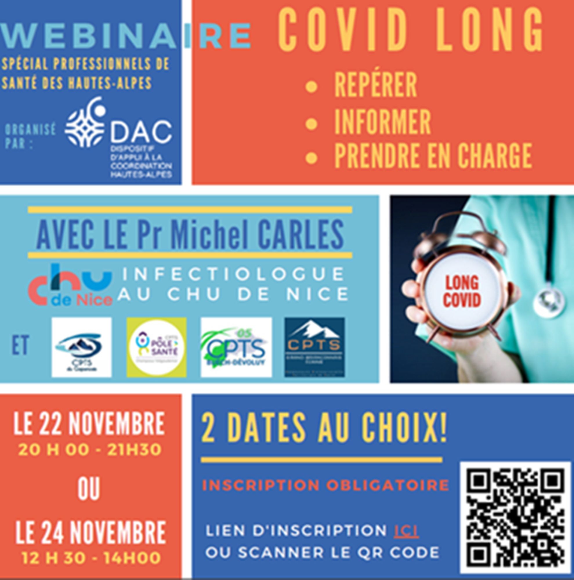 - 2 webinaires « covid long », ouverts aux professionnels de Santé du territoire pour répondre à leurs interrogations, prévus les 22 ou 24 novembre, avec Pr Michel Carles, Chef du service infectiologie au CHU de Nice, et Président du conseil scientifique de « TousPartenairesCovid ». Inscription obligatoire