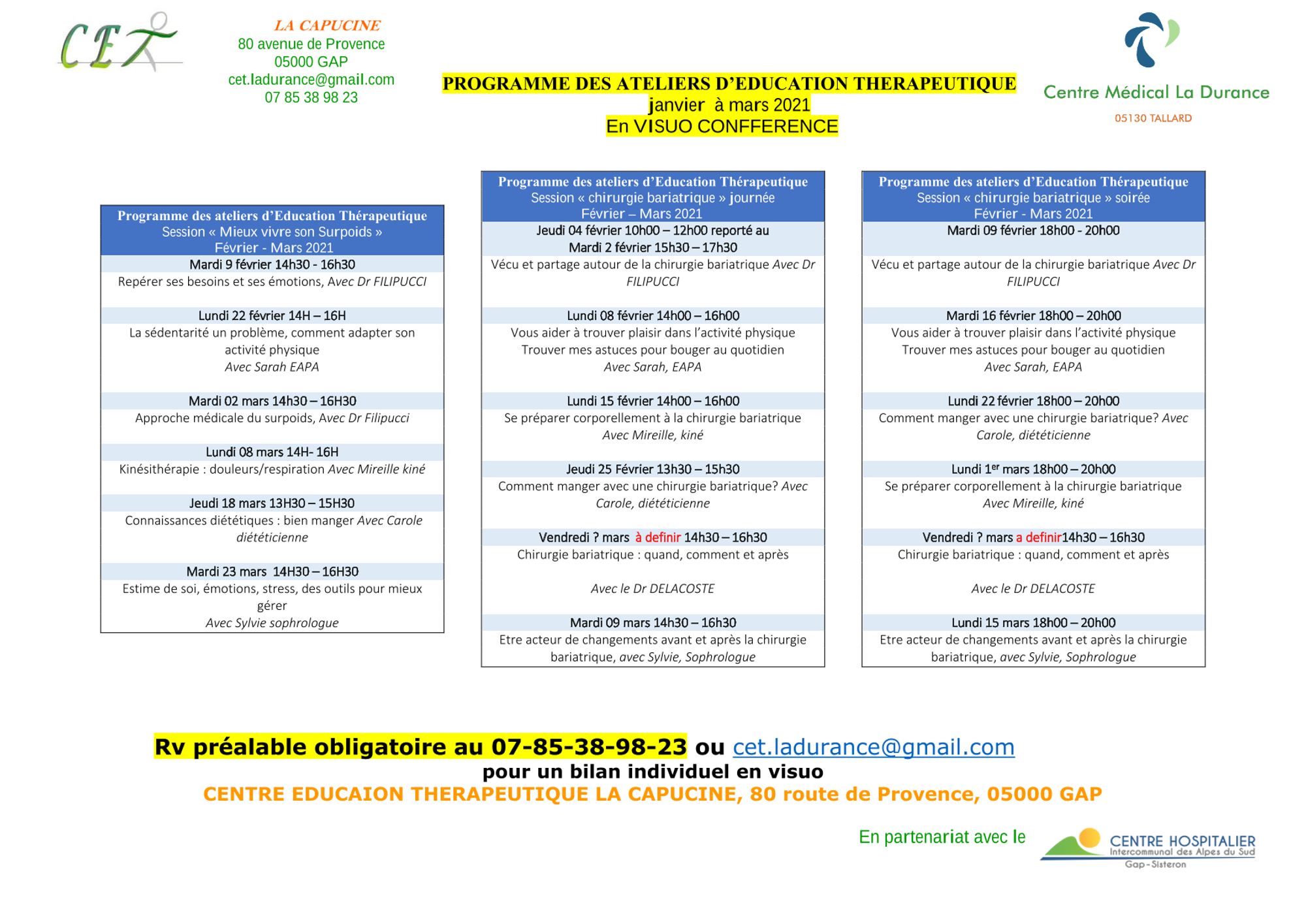 Planning d'Education Thérapeutique à partir de Janvier 2021