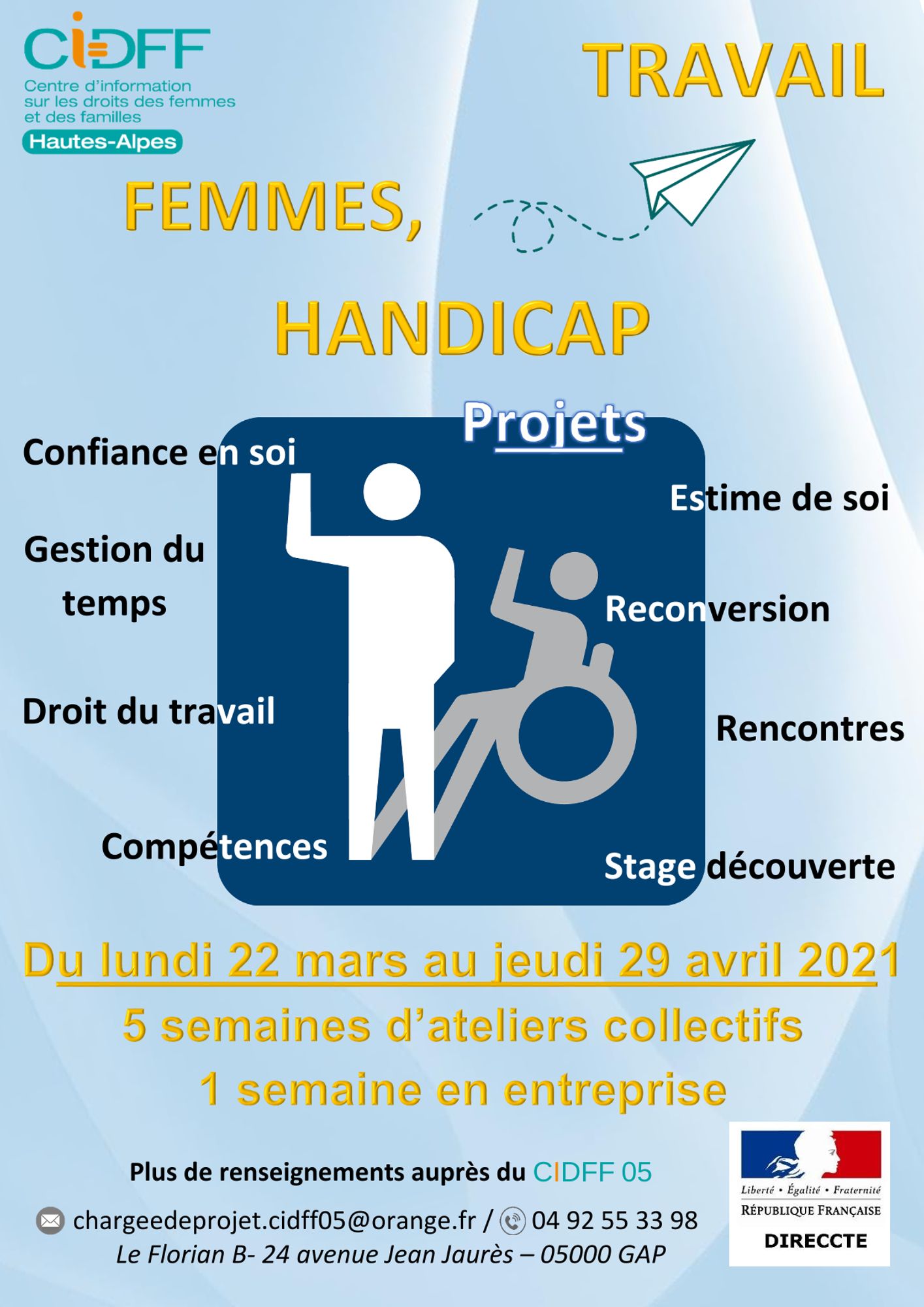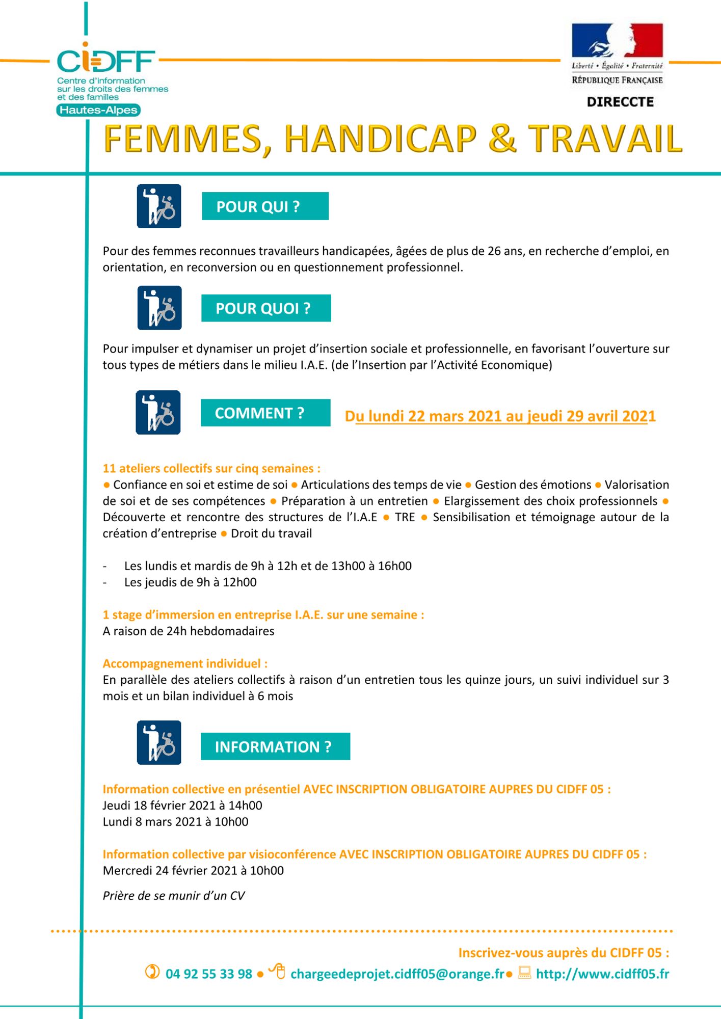 L'équipe du CIDFF 05 met en place une nouvelle action collective portée par l'association, à compter du lundi 22 mars 2021 et jusqu'au jeudi 29 avril 2021, à destination des femmes en situation de handicap.