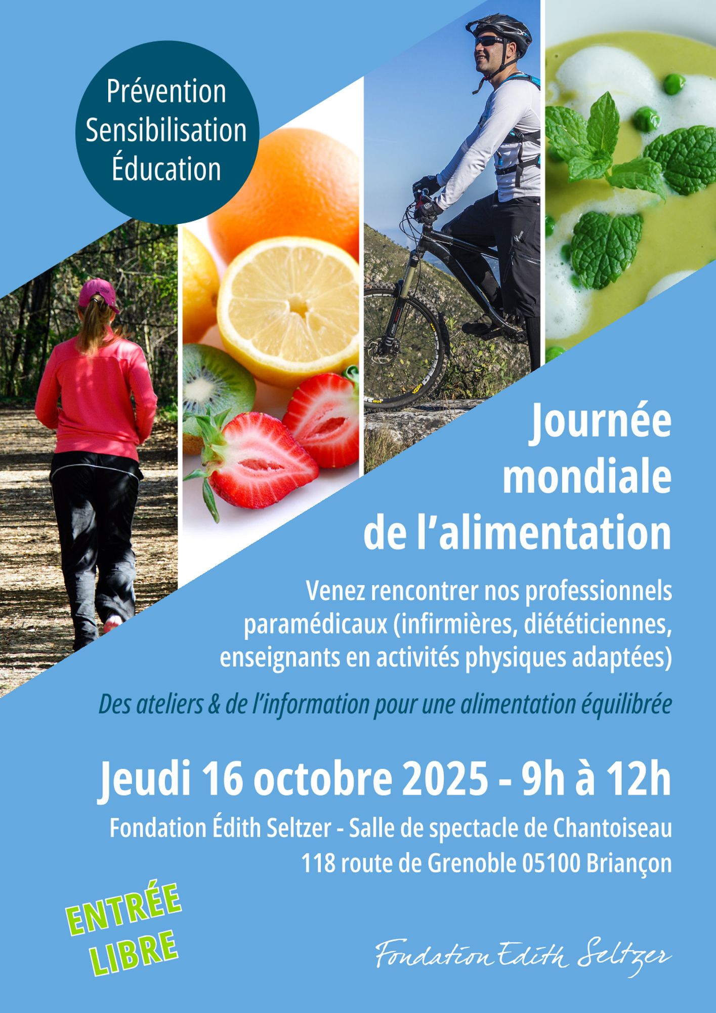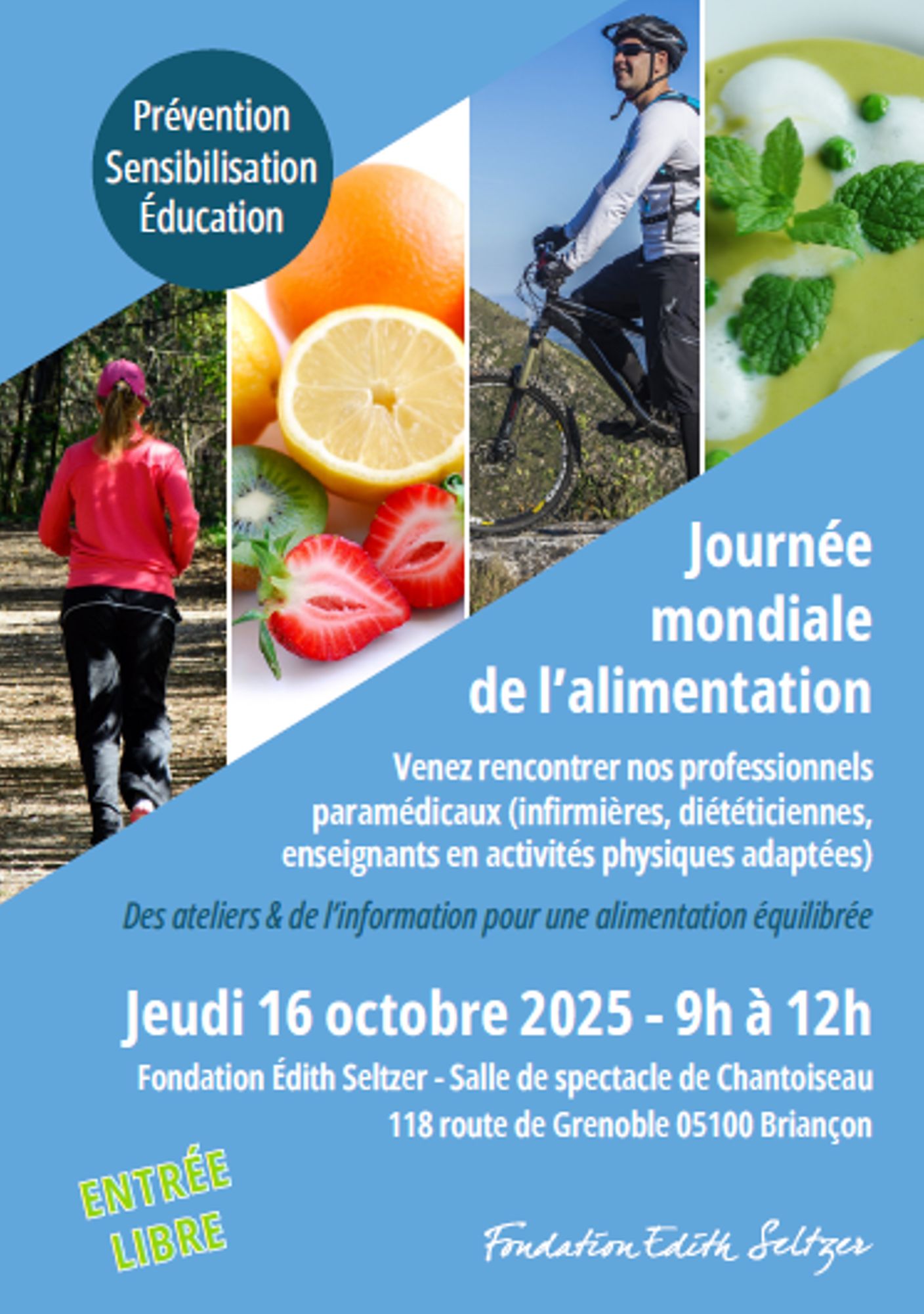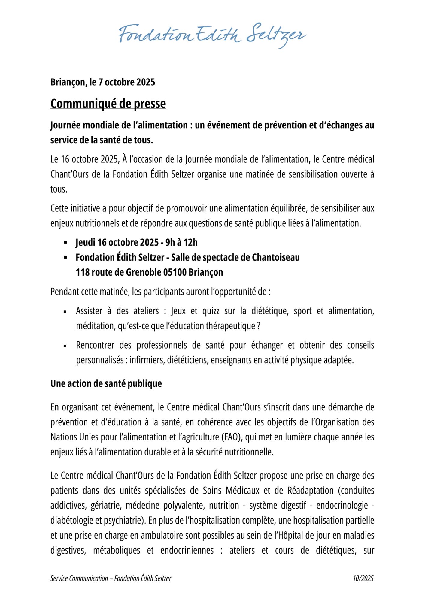 Le 16 octobre 2025, À l’occasion de la Journée mondiale de l’alimentation, le Centre médical Chant’Ours de la Fondation Édith Seltzer organise une matinée de sensibilisation ouverte à tous. Cette initiative a pour objectif de promouvoir une alimentation équilibrée, de sensibiliser aux enjeux nutritionnels et de répondre aux questions de santé publique liées à l’alimentation.