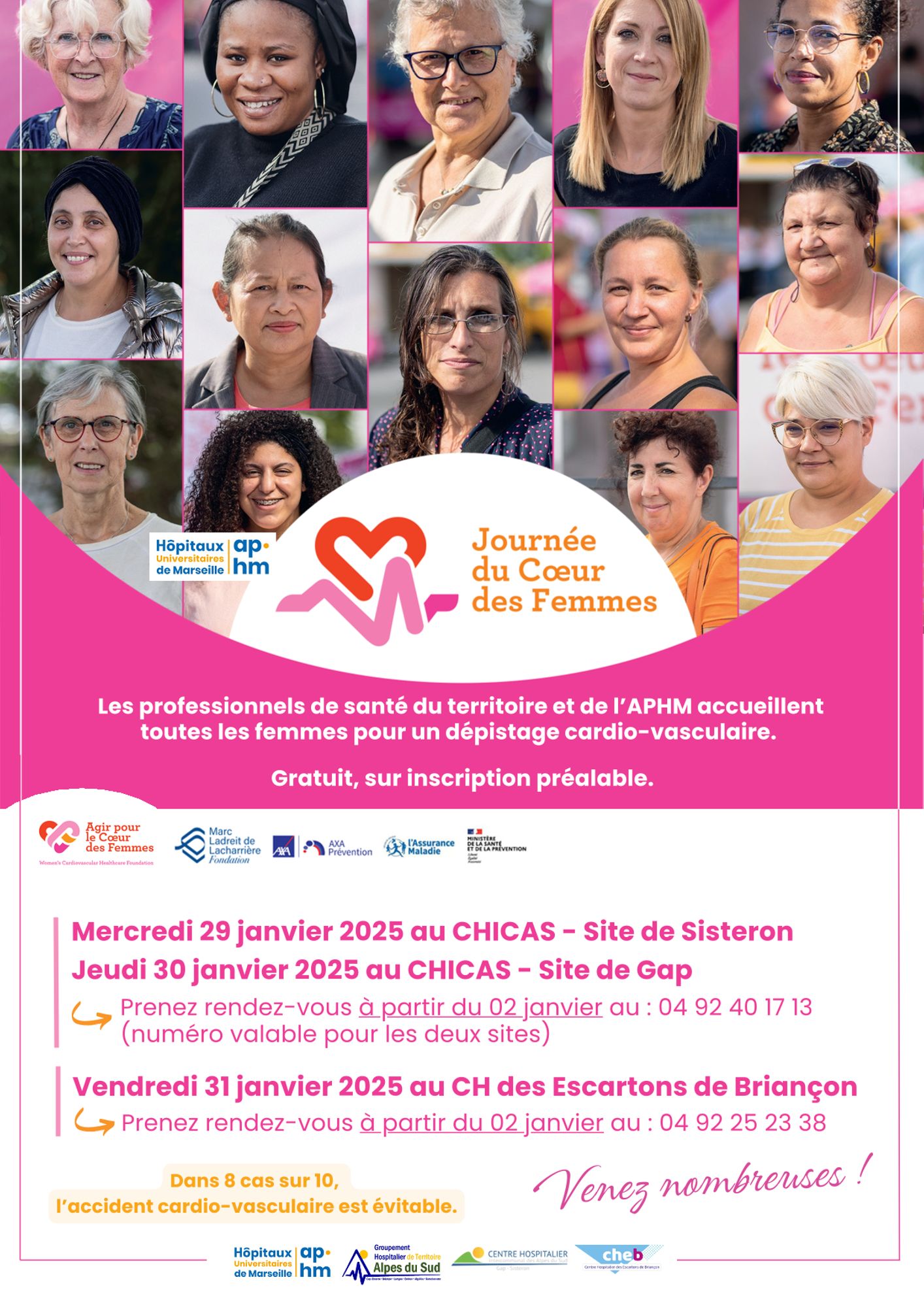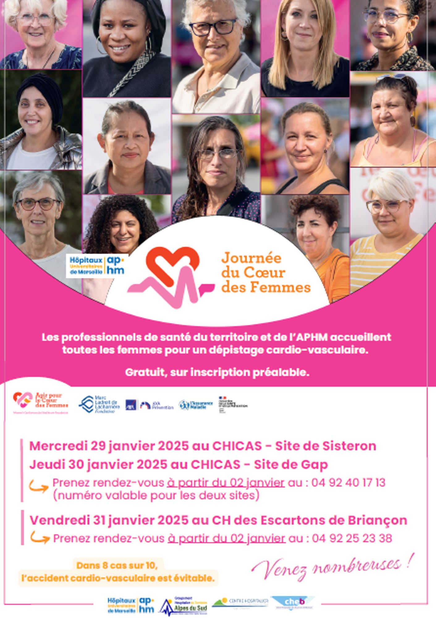 Le groupement hospitalier de territoire des Alpes du Sud s’associe à l’association Agir pour le cœur des femmes et aux professionnels de l’AP-HM afin d’organiser une journée de dépistage des risques en santé chez la femme et de prévenir le risque cardio-vasculaire.