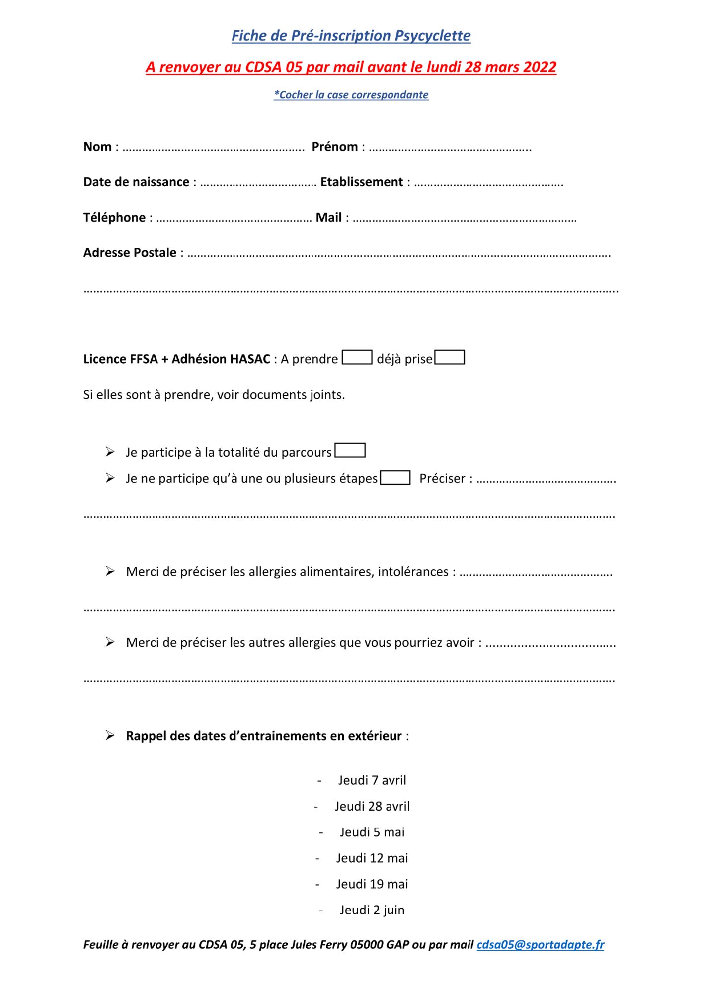 Afin de s'organiser au mieux, le CDSA 05 aimerait savoir le nombre de personnes intéressées pour participer au séjour psycyclette. Si c’est votre cas, merci de remplir la fiche de pré-inscription ci-joint et de nous la renvoyer à cdsa05@sportadapte.fr