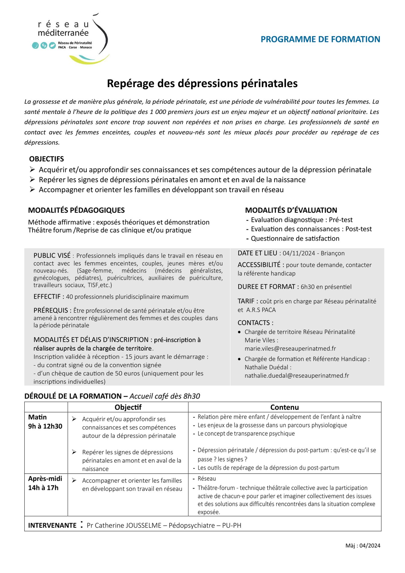 La formation est intégralement prise en charge par le Réseau de Périnatalité Méditerranée PACA Corse Monaco. Seuls les frais de déplacement et de restauration sont à votre charge.