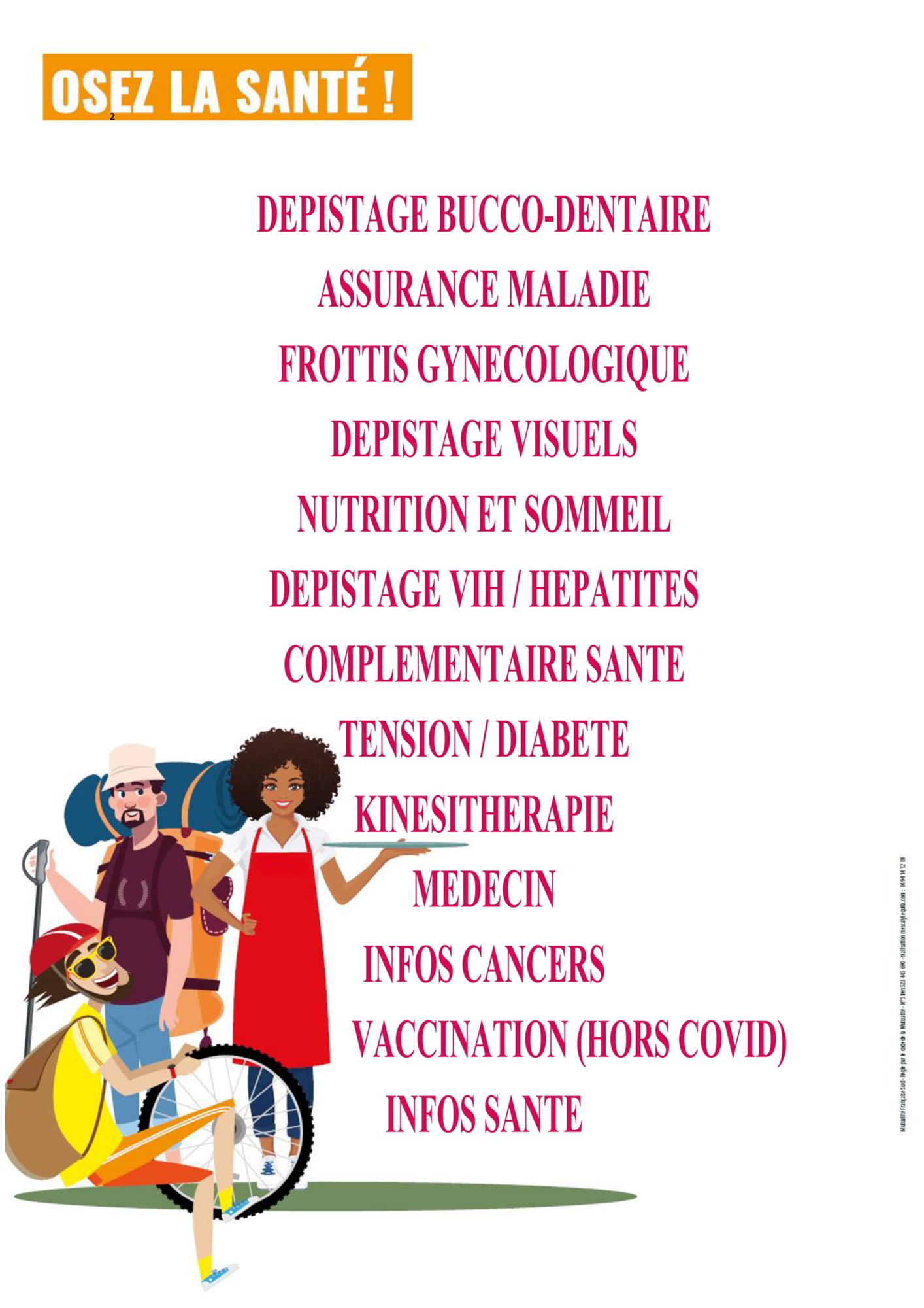 La journée prévention santé permet aux personnes d’effectuer un check’up sur la santé en profitant de dépistages anonymes et gratuits, ainsi que de conseils auprès de professionnels de la prévention. Parmi la multitude de tests proposés, on retrouve un bilan kinésithérapique, buccodentaire, tension, diabète, VIH/hépatites, vision, audition, frottis gynécologique…, ainsi que des informations sur les droits (CPAM, complémentaire santé), nutrition, sexualité, cancer…