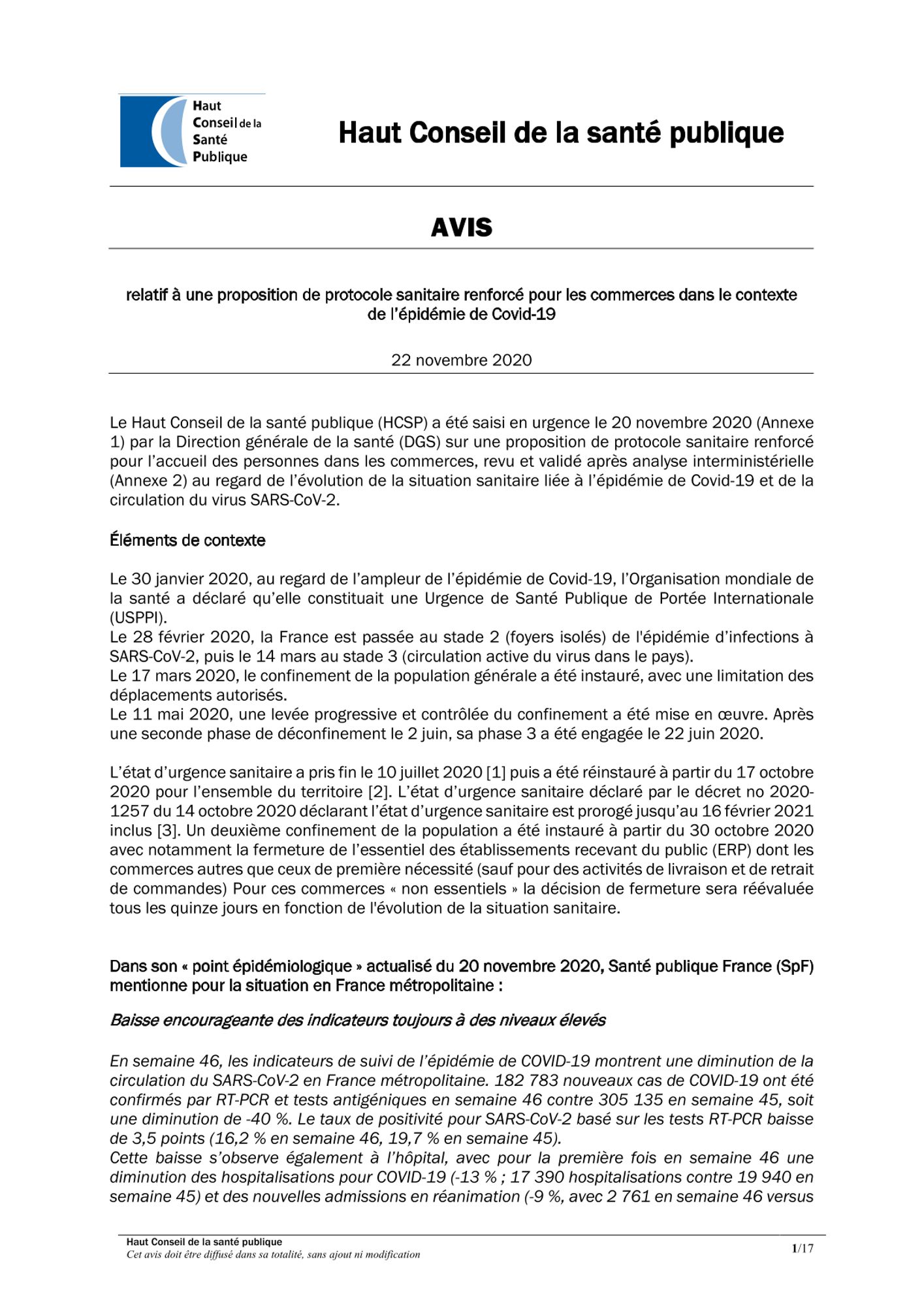 Avis du HCSP sur le protocole sanitaire renforcé proposé pour les commerces