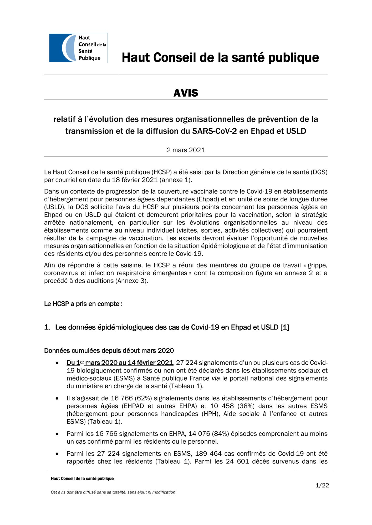 Le HCSP propose des mesures visant à assouplir les recommandations actuellement en vigueur dans ces structures pour prévenir la transmission et la diffusion du SARS-CoV-2 qu’il s’agisse des visites en chambre, des activités collectives organisées, des repas collectifs et des sorties.