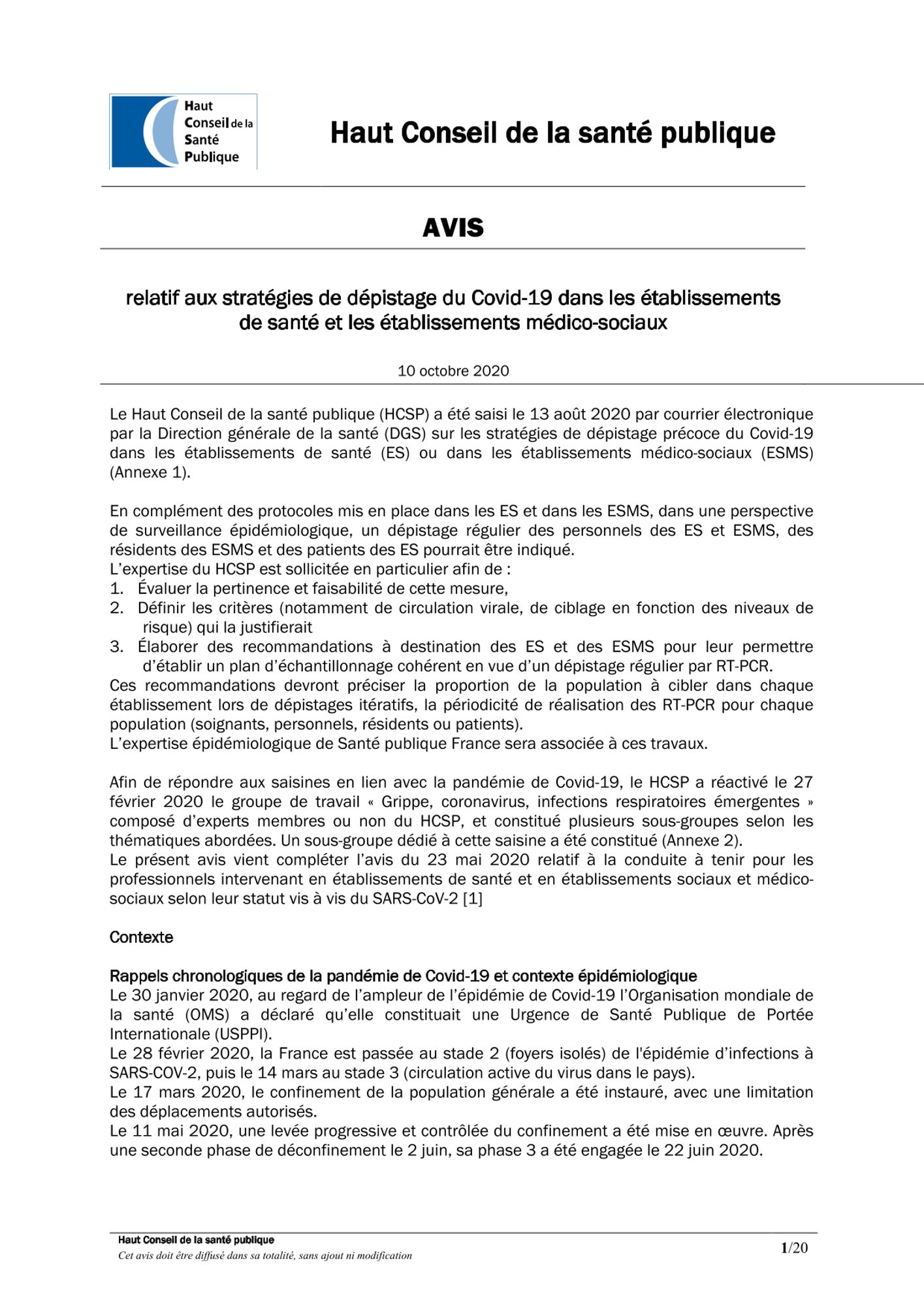 Saisi sur la stratégie à adopter, le Haut Conseil de la santé publique (HCSP) a évalué les différentes techniques de prélèvement et d’analyses disponibles ainsi que les pratiques mises en place, au regard des études publiées et des recommandations nationales et internationales.