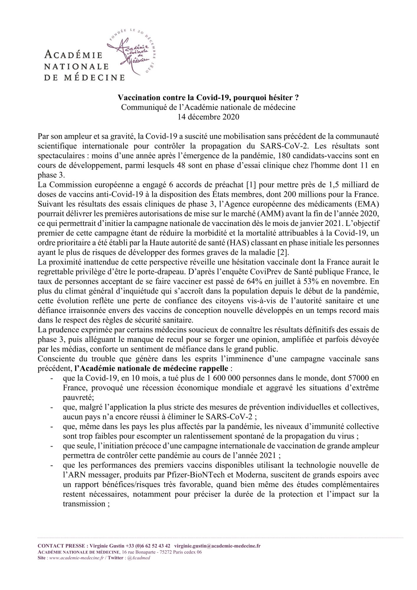 Communiqué de l’Académie : Vaccination contre la Covid-19, pourquoi hésiter ?