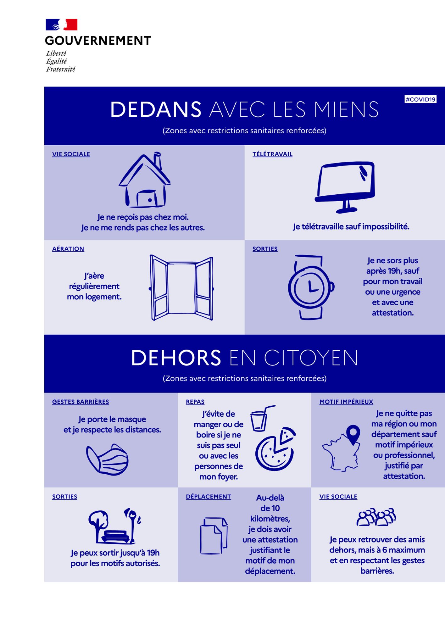 - Je ne reçois pas de personnes extérieures à mon foyer à l’exception des aides à domicile et service à la personne ;