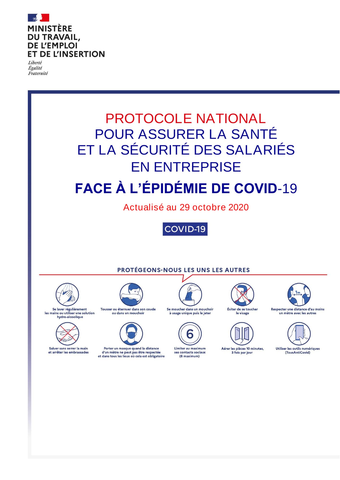 Nouveau protocole national pour assurer la santé et la sécurité des salarié.es en entreprise face à l'épidémie de Covid-19 actualisé le 29 octobre 2020.