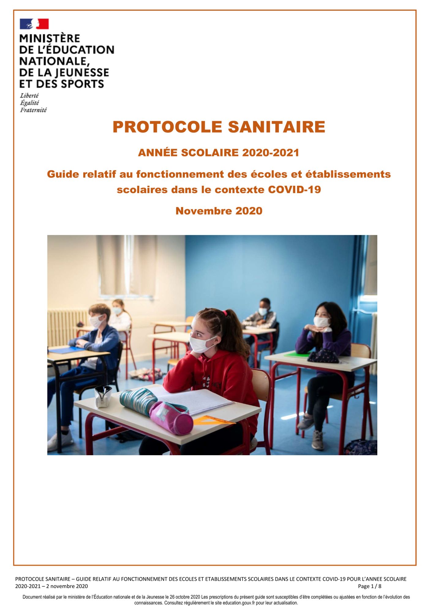 Protocole sanitaire pour l'année scolaire 2020-2021 - Guide relatif au fonctionnement des écoles et établissements scolaires dans le contexte COVID-19 actualisé en novembre 2020.
