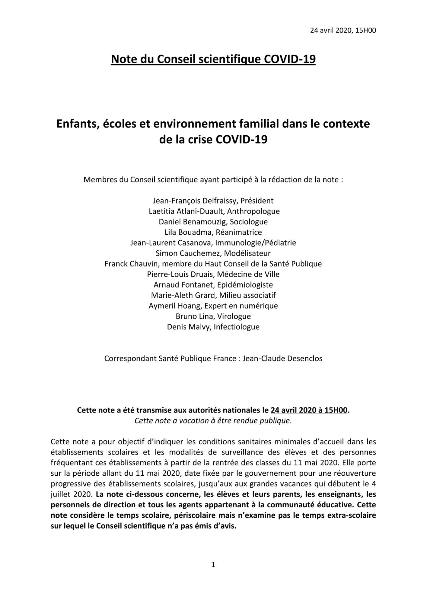Il est accompagné d'une note de 11 pages, datée du 24 avril, intitulée "Enfants, écoles et environnement familial dans le contexte de la crise du Covid-19" dans laquelle le conseil "pr[end] acte" de la volonté de l'exécutif d'entamer une reprise des cours à compter du 11 mai.