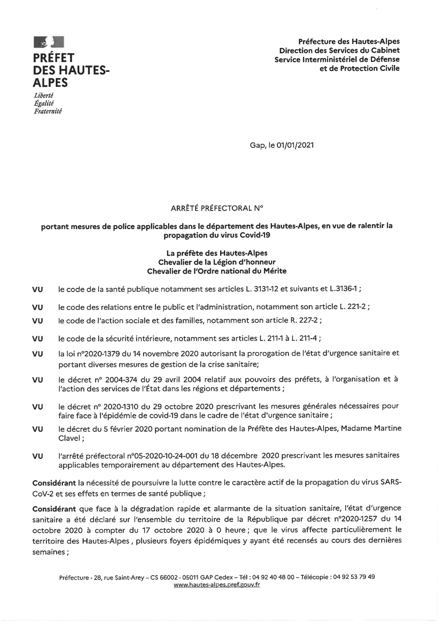 Le Gouvernement a mis en place un couvre-feu à 18h00 à partir du samedi 2 janvier 2021 dans le département des Hautes-Alpes.