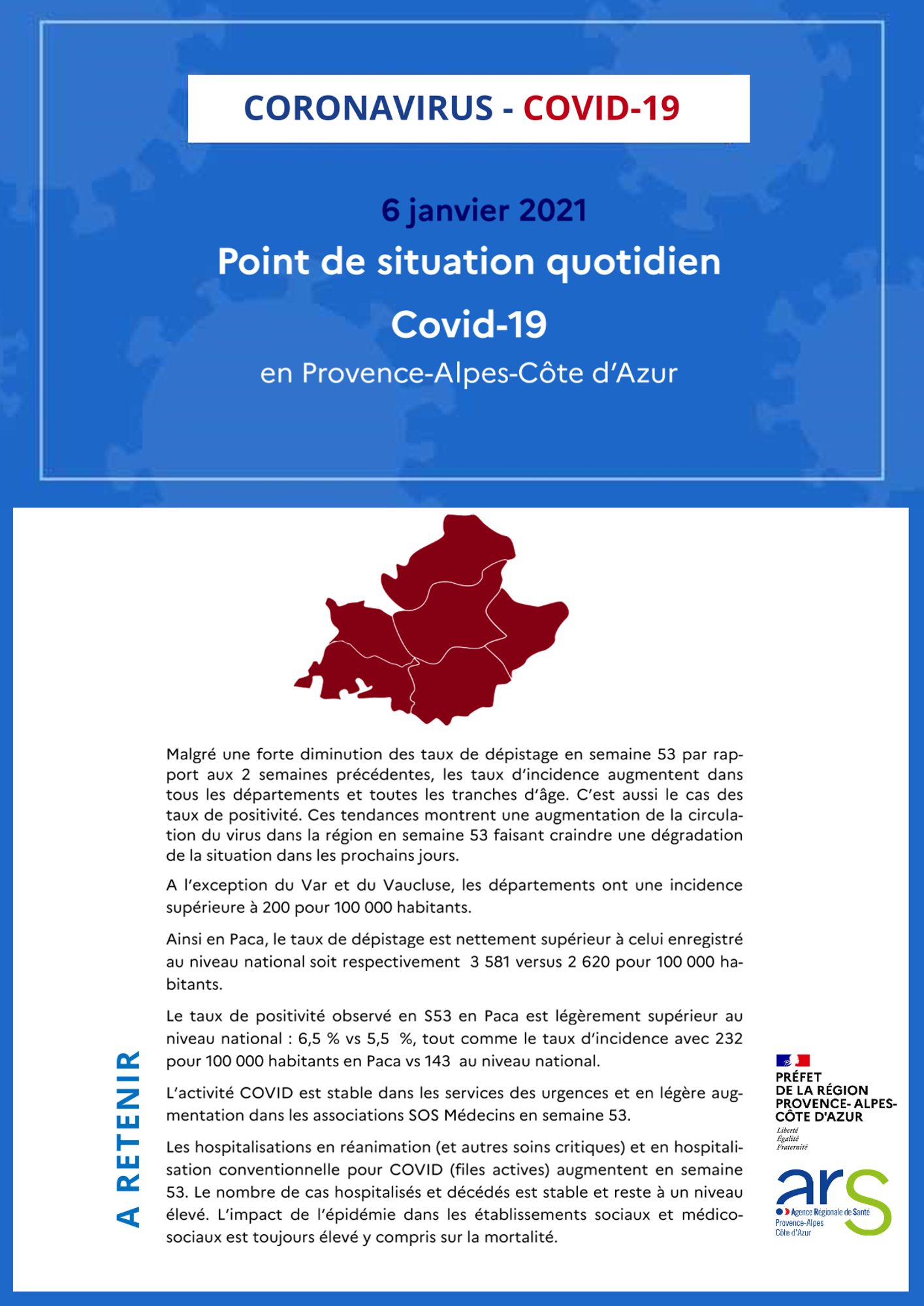 Le taux d’incidence dans le département est de 270 pour 100 000 habitants, soit au-dessus du seuil de 200 voulu par le Gouvernement. Il y a, au 6 janvier 2021, 46 personnes hospitalisées cause Covid dans les Hautes-Alpes et 10 en réanimation. Depuis le début de la crise 145 personnes en sont décédés à l'hopital et 41 en EHPAD. 14 clusters sont actifs sur le département.