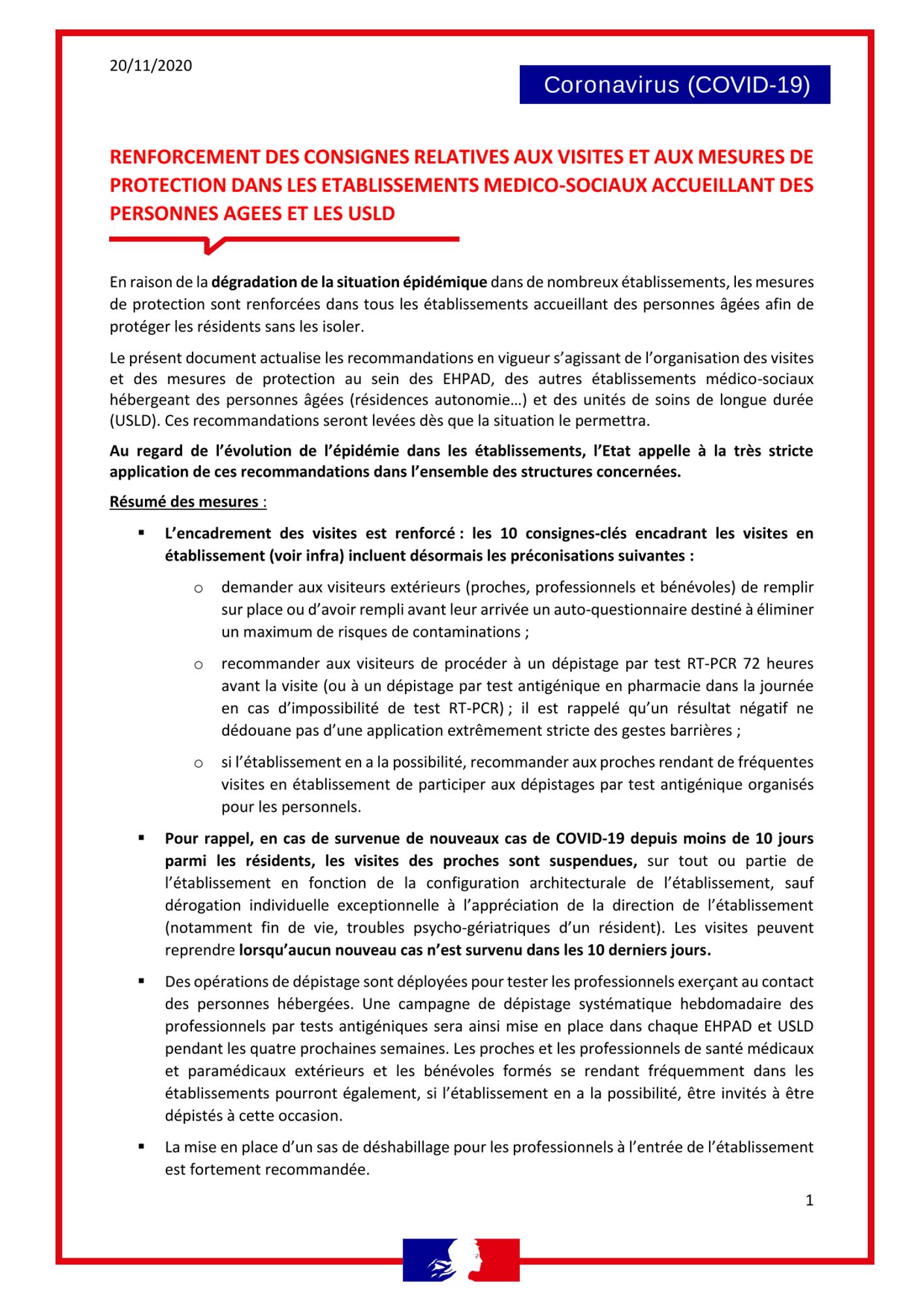 Les 10 consignes-clés encadrant les visites en établissement (voir infra) incluent désormais les préconisations suivantes :