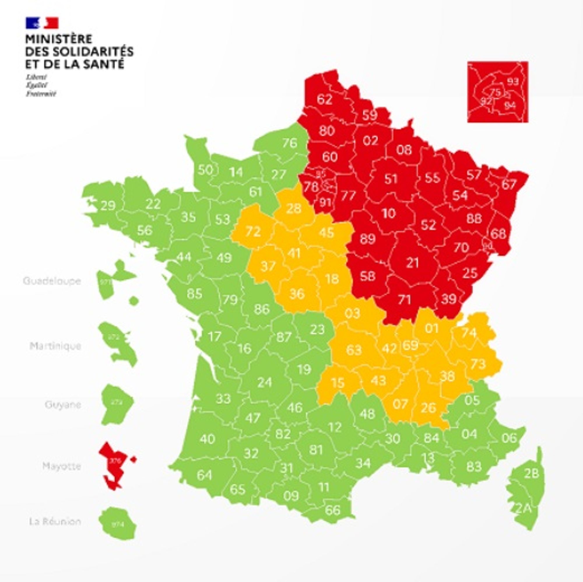 Vous trouverez sur le site du Ministère des Solidarités et de la Santé les cartes de circulation du virus et l’état de la tension hospitalière sur les capacités en réanimation département par département.