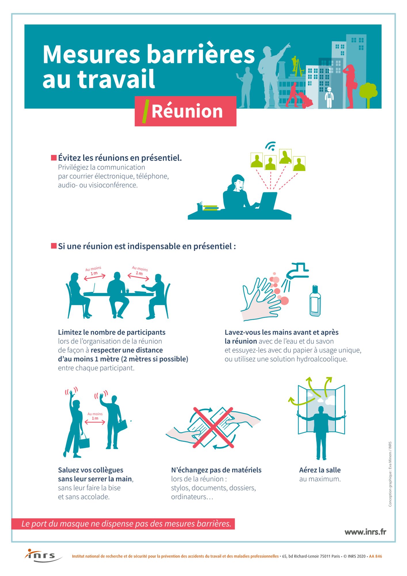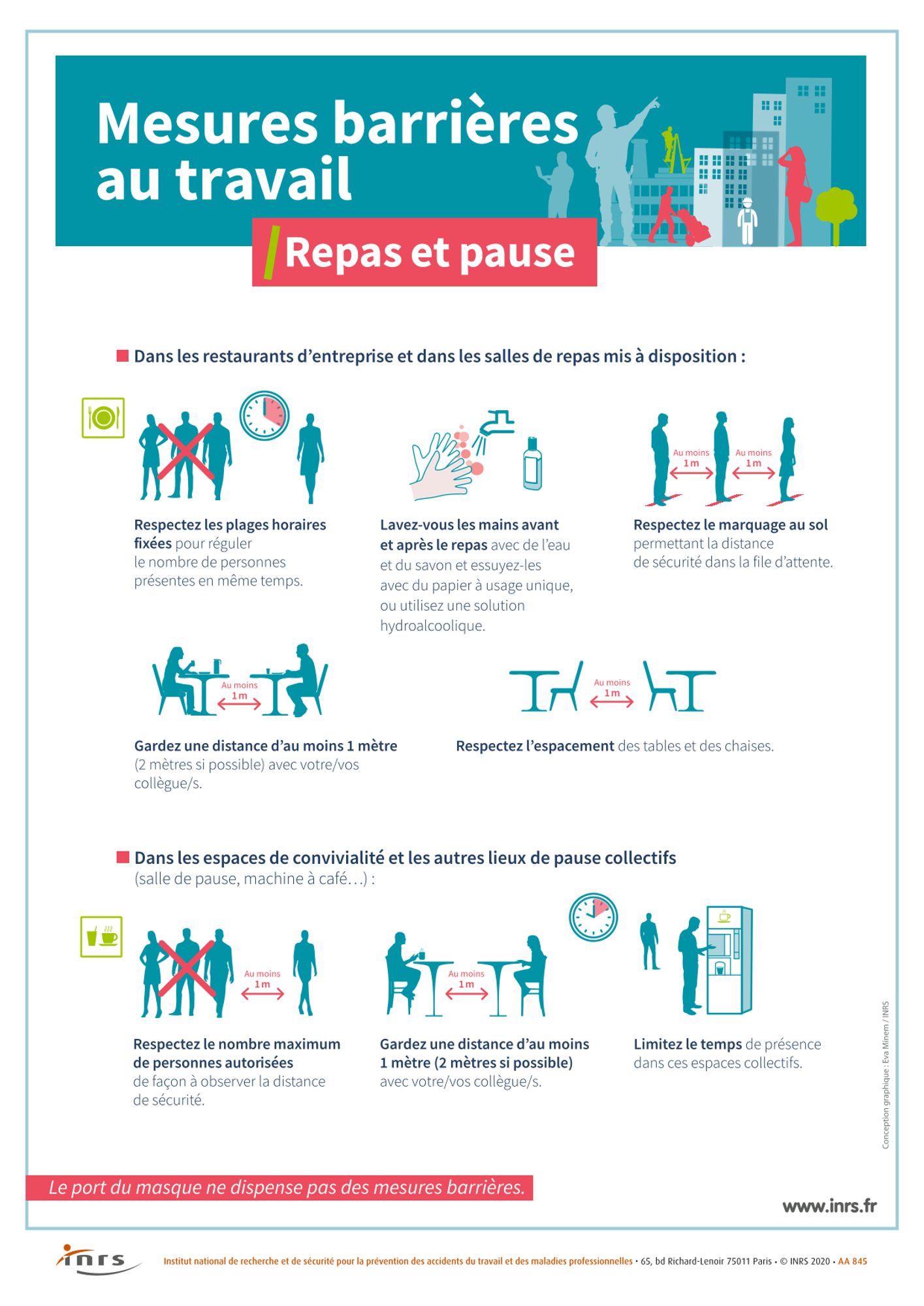 Mesures de distanciation physique, gestes barrières, port du masque… L'Institut national de recherche et de sécurité au travail (INRS) publie également de nouvelles affiches pour sensibiliser les salariés en entreprises sur les mesures de prévention à appliquer (milieu du travail, repas et pauses, réunions...).