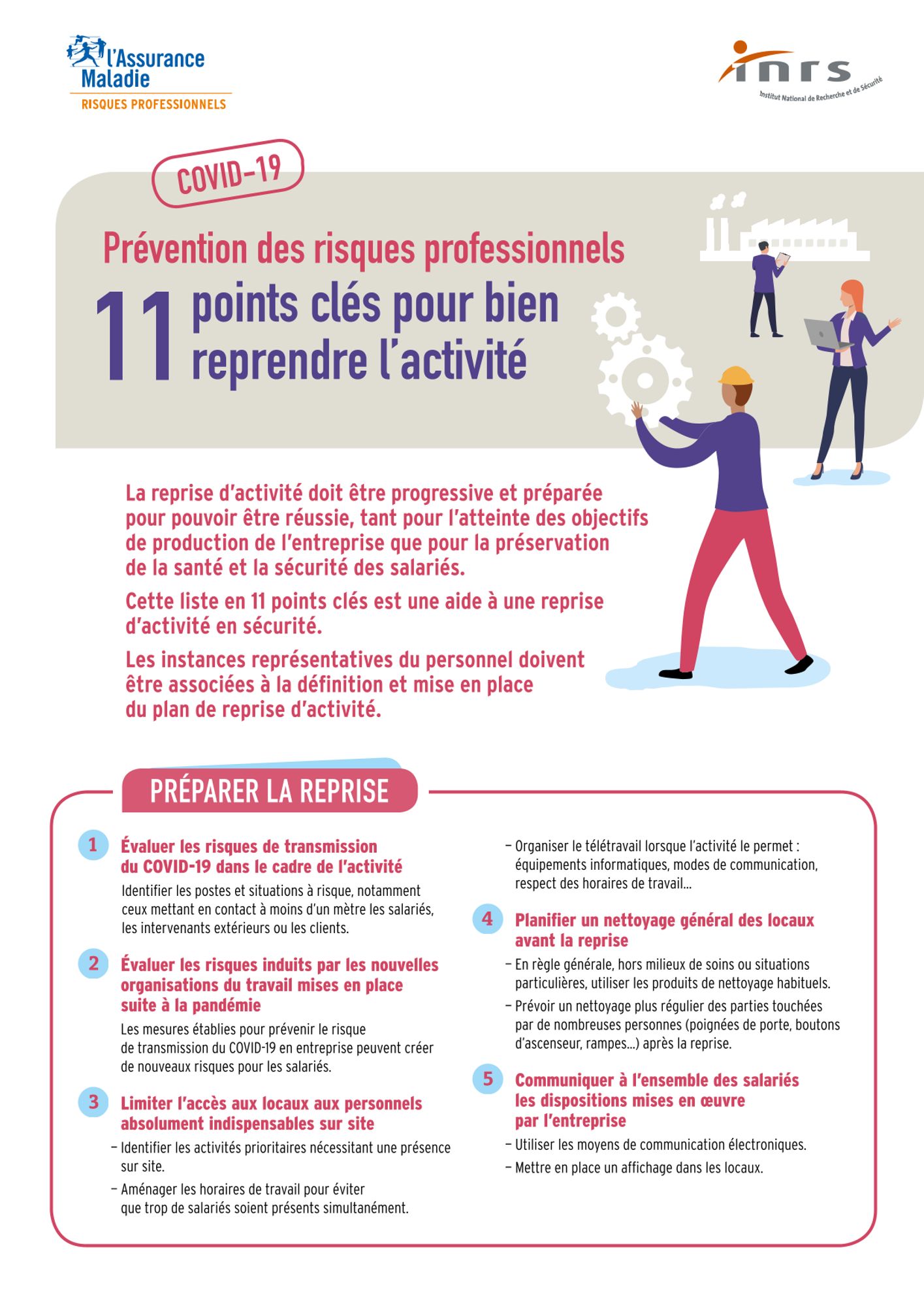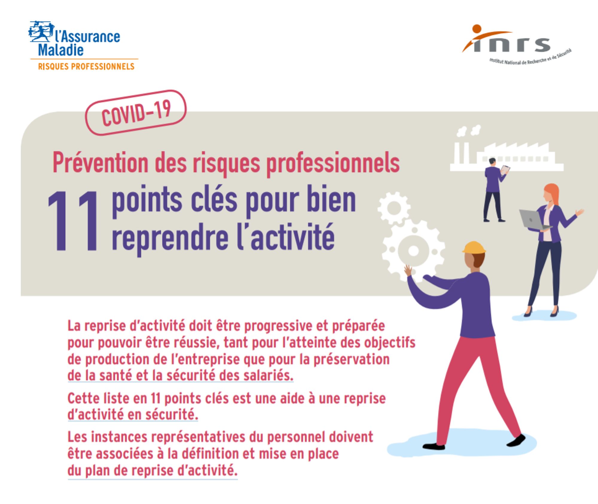 Cette liste en 11 points clés repérés par l'Assurance Maladie et l'INRS (Institut National de Recherche et de Sécurité) est une aide à une reprise d’activité en sécurité.