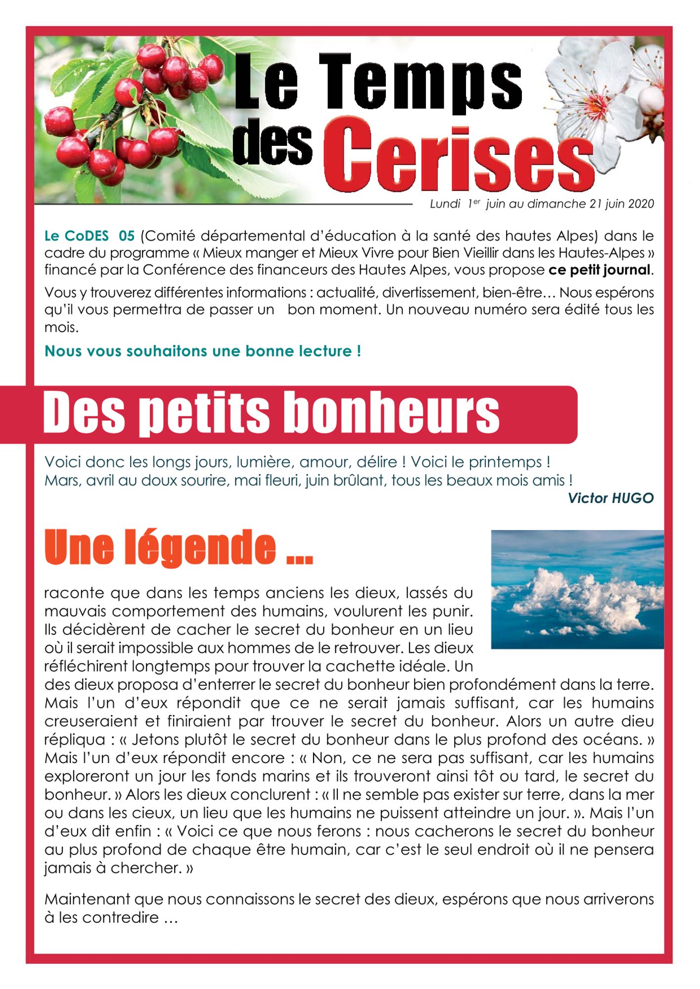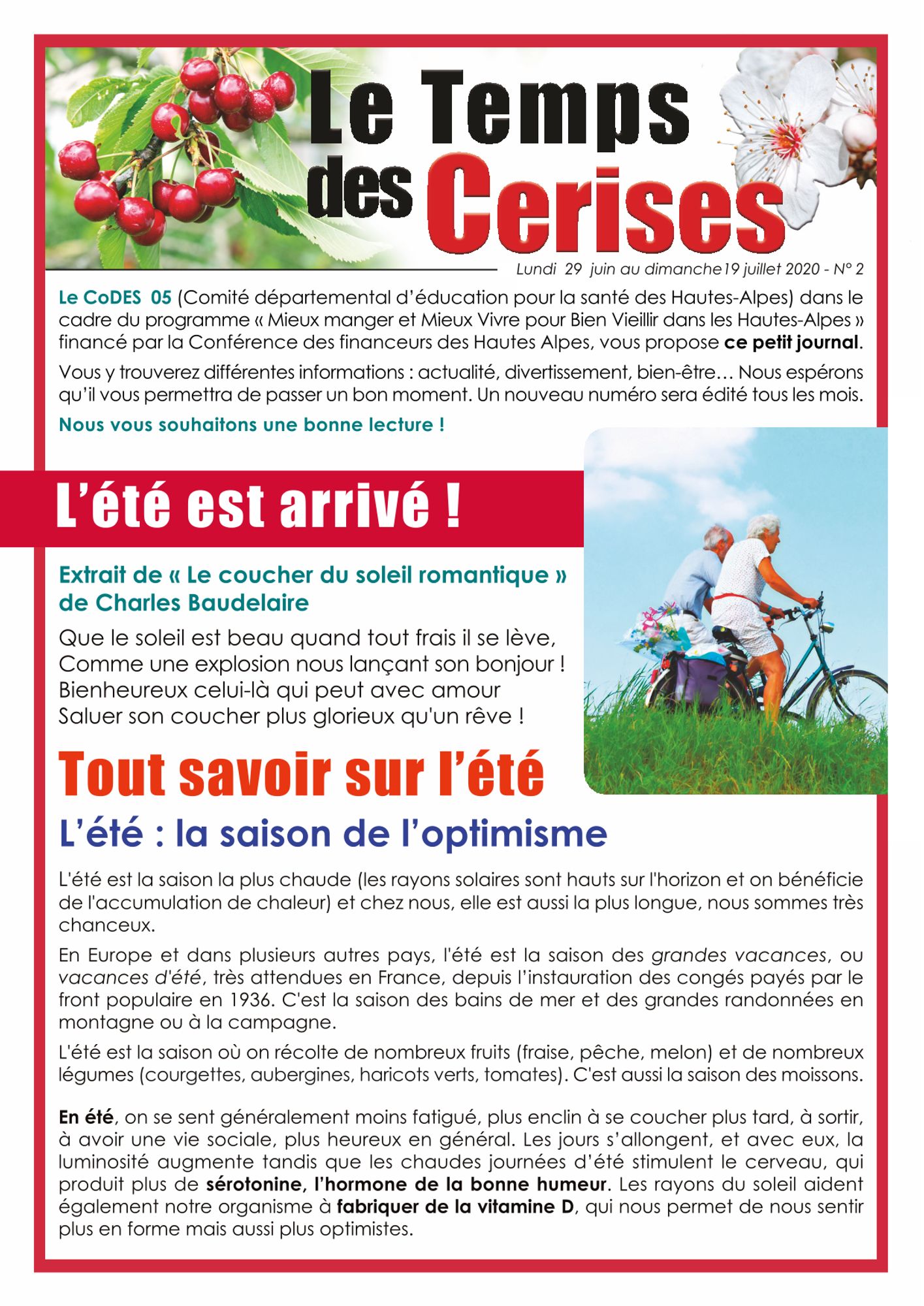 Le CoDES 05 a créé ce journal afin de garder le lien avec le public senior, de leur apporter un peu de gaieté et de leur faire parvenir des messages de santé publique.