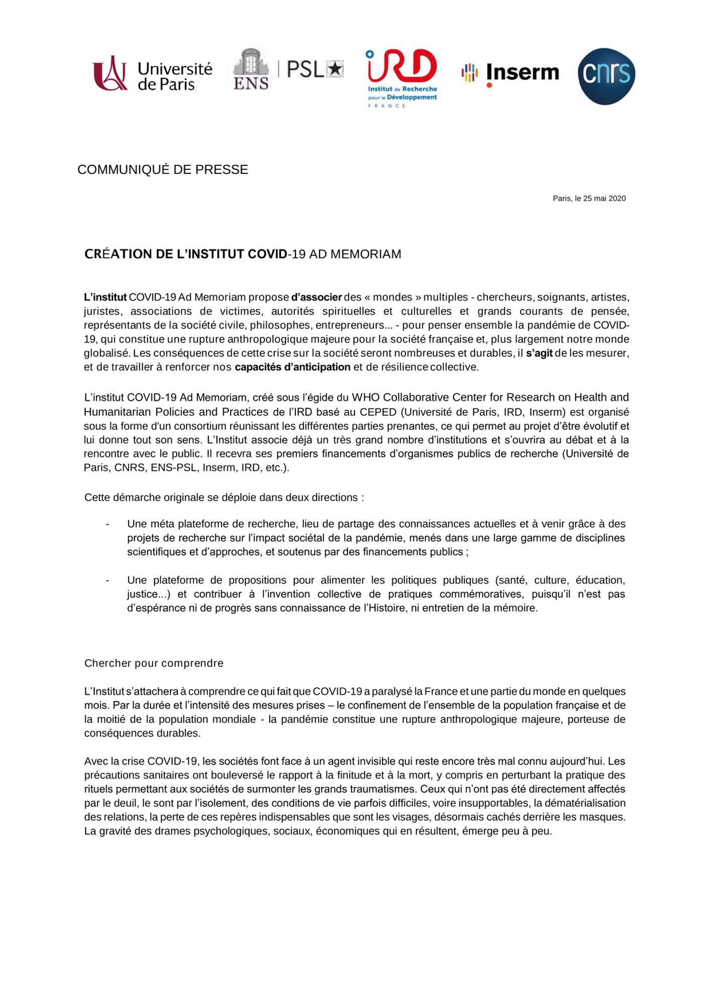 Création de l'institut Covid-19 Ad Memoriam