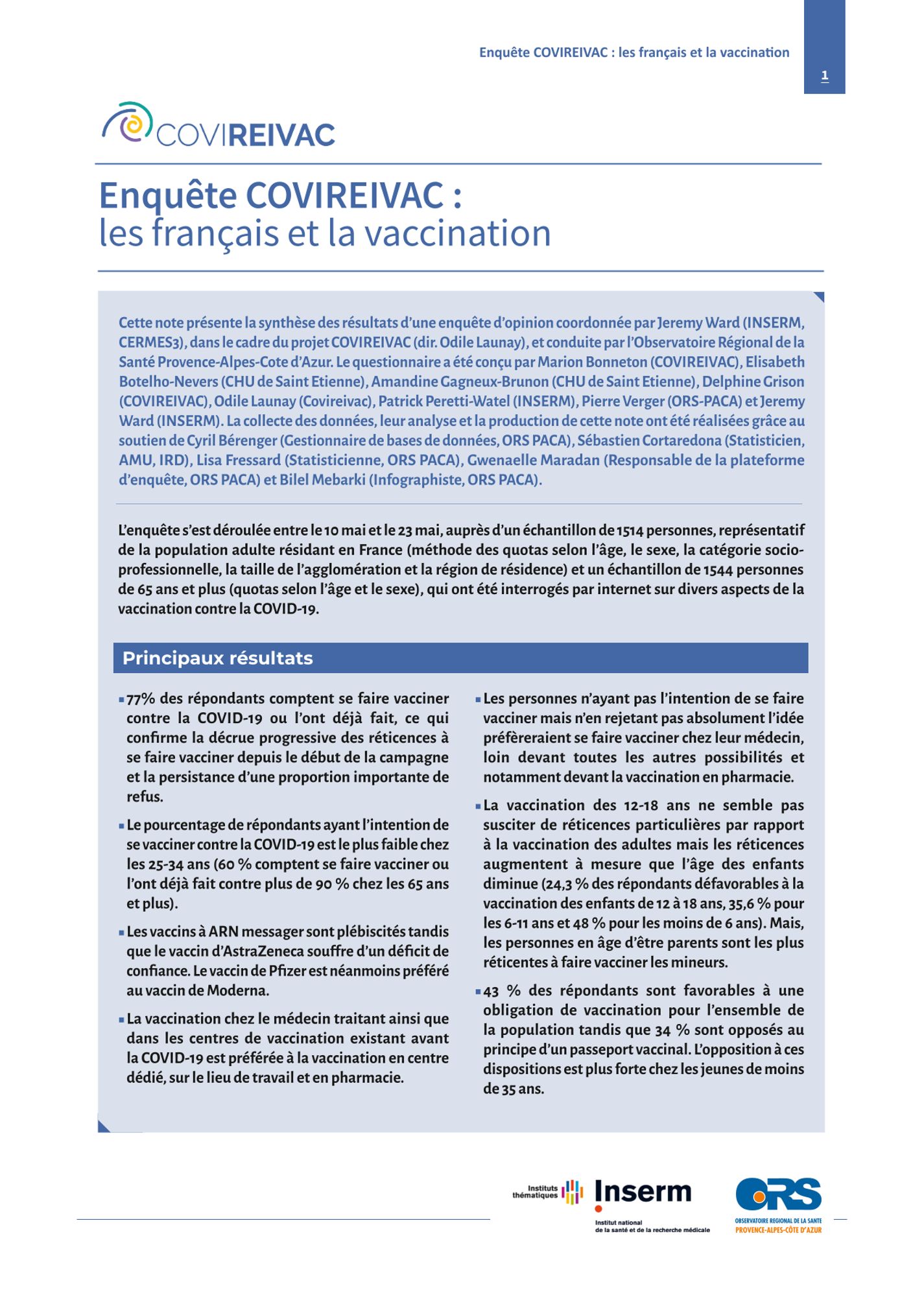 L’enquête COVIREIVAC s’est déroulée entre le 10 mai et le 23 mai, auprès d’un échantillon de 1514 personnes, représentatif de la population adulte résidant en France et un échantillon de 1544 personnes de 65 ans et plus, qui ont été interrogés par internet sur divers aspects de la vaccination contre la COVID-19.
