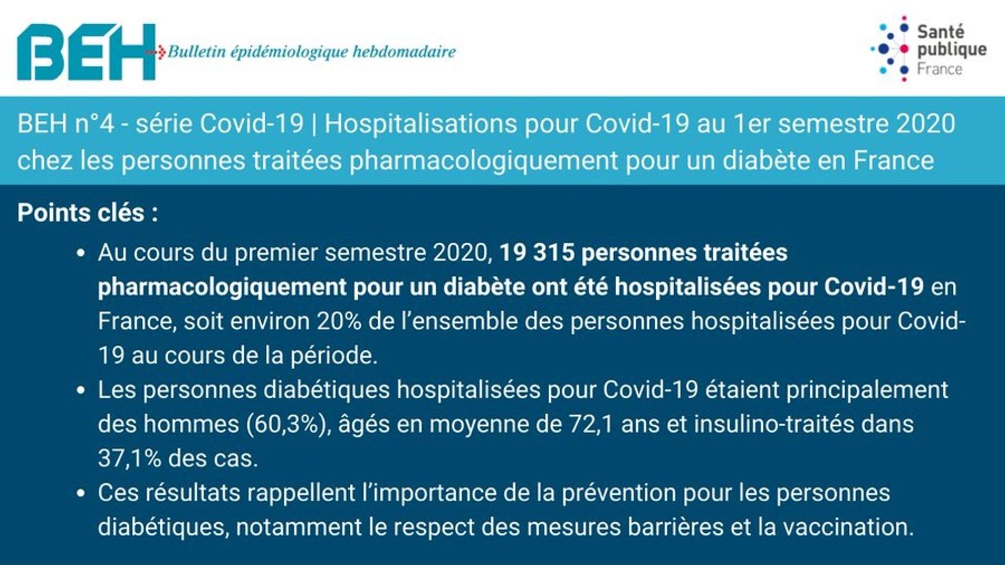 Au cours du premier semestre 2020, 19 315 personnes traitées pharmacologiquement pour un diabète ont été hospitalisées pour Covid-19 en France, soit environ 20% de l’ensemble des personnes hospitalisées pour Covid-19 au cours de la période.