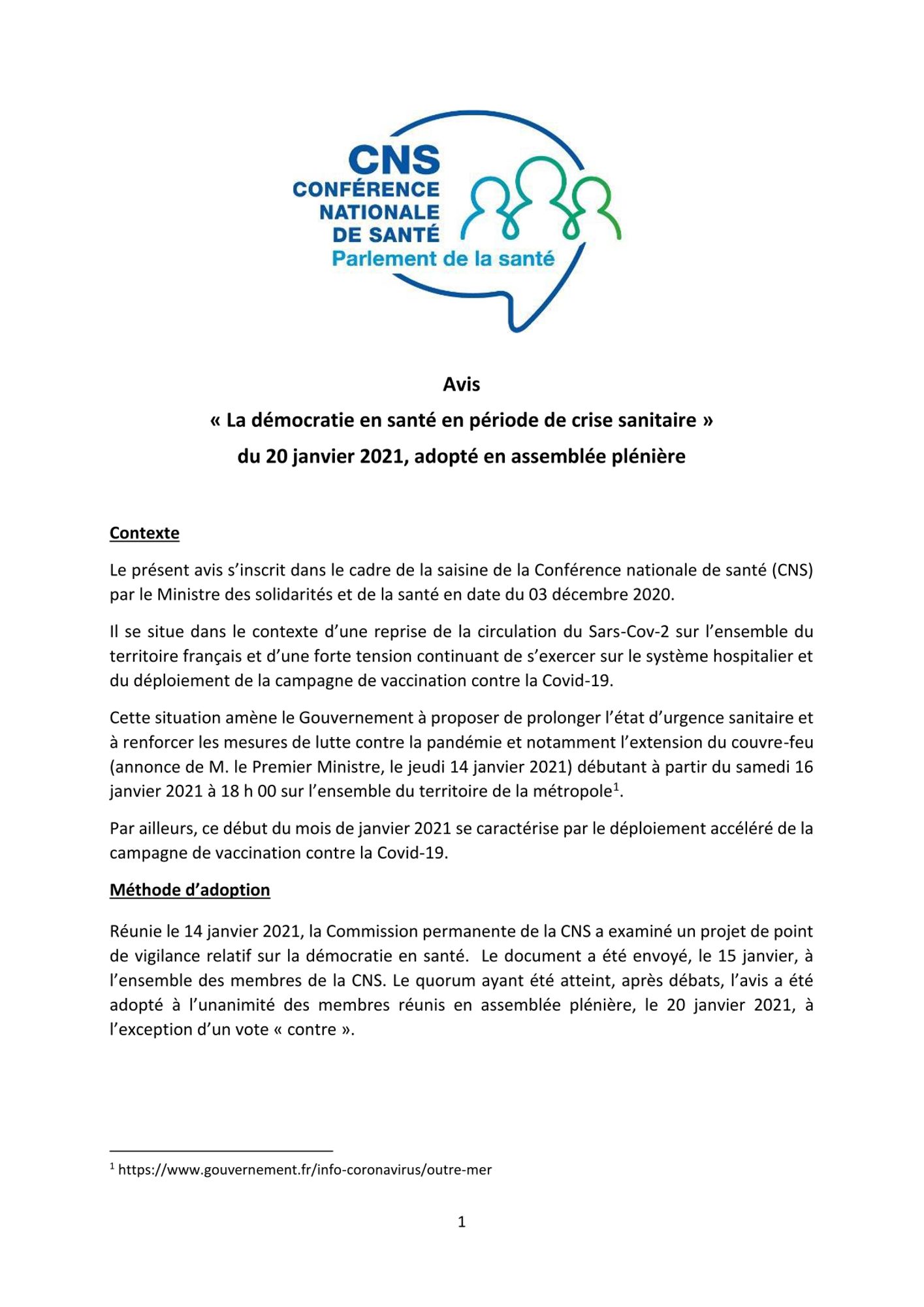 Avis de la Conférence Nationale de Santé (CNS) du 20 janvier