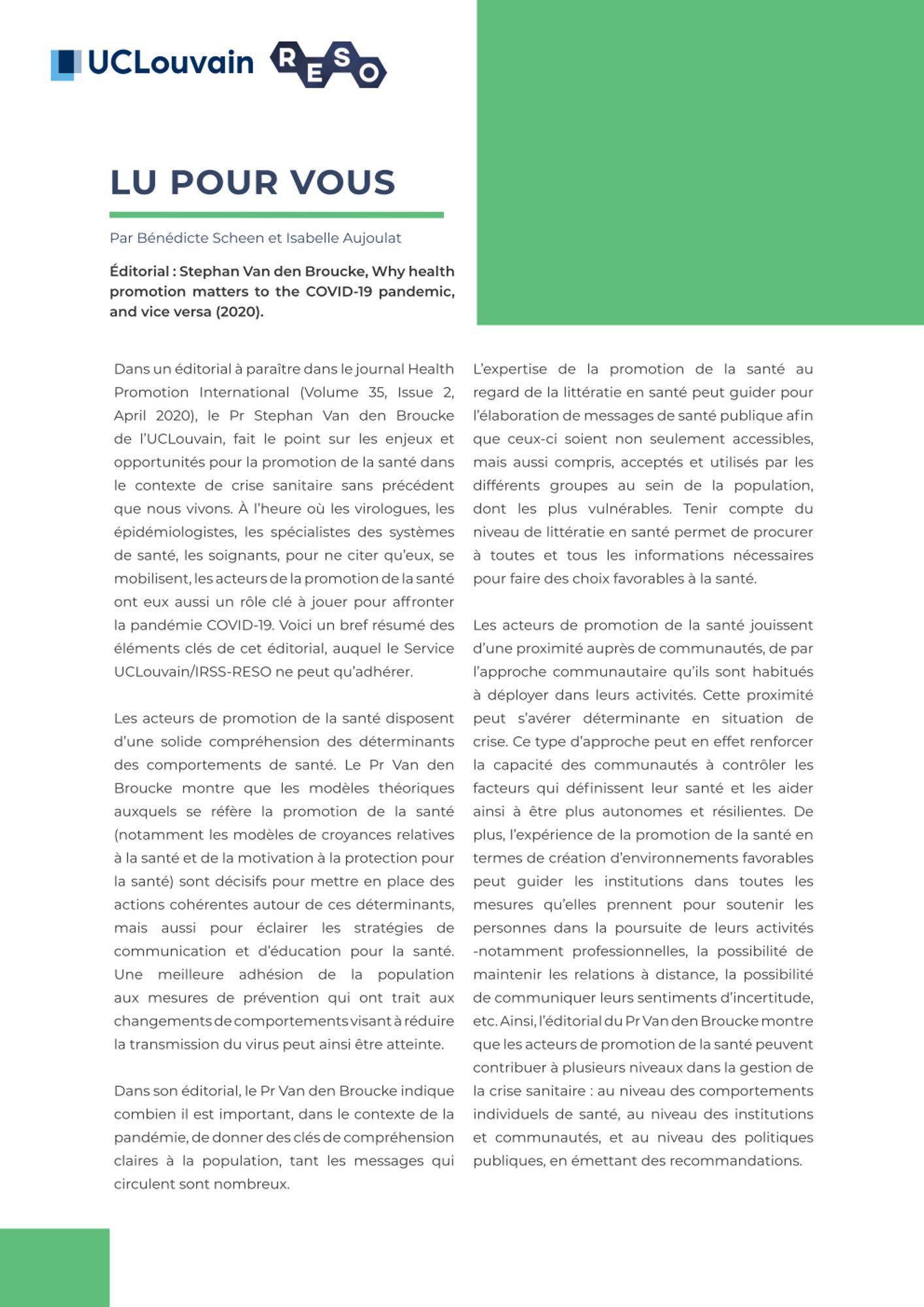 Dans un éditorial à paraître dans le journal Health Promotion International (Volume 35, Issue 2, April 2020), le Pr Stephan Van den Broucke de l’UCLouvain, fait le point sur les enjeux et opportunités pour la promotion de la santé dans le contexte de crise sanitaire sans précédent que nous vivons.