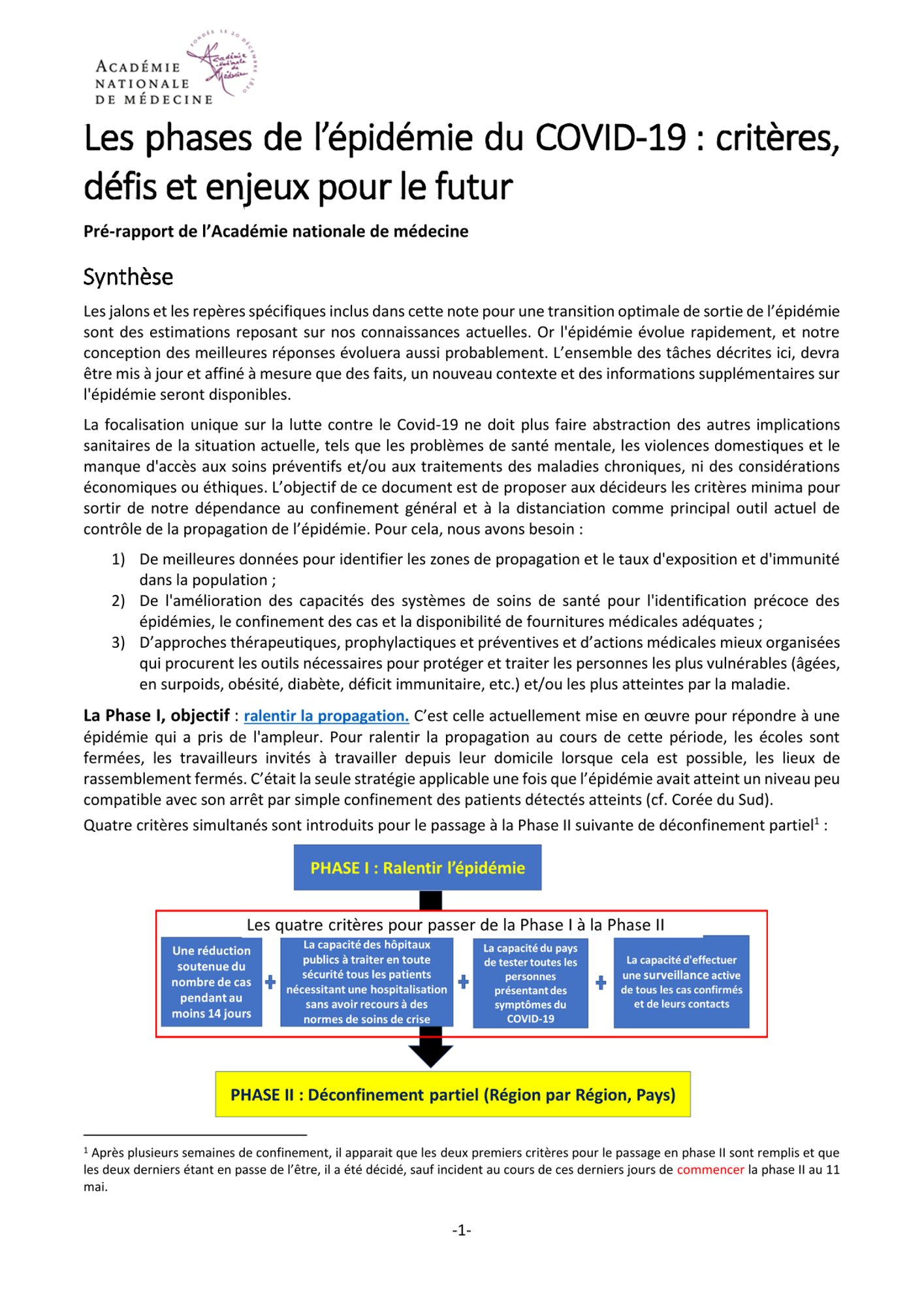 L'Académie de Médecine propose dans ce pré-rapport de définir les objectifs, les seuils d'acTions et les éléments déclencheurs des 4 phases de l'épidémie :