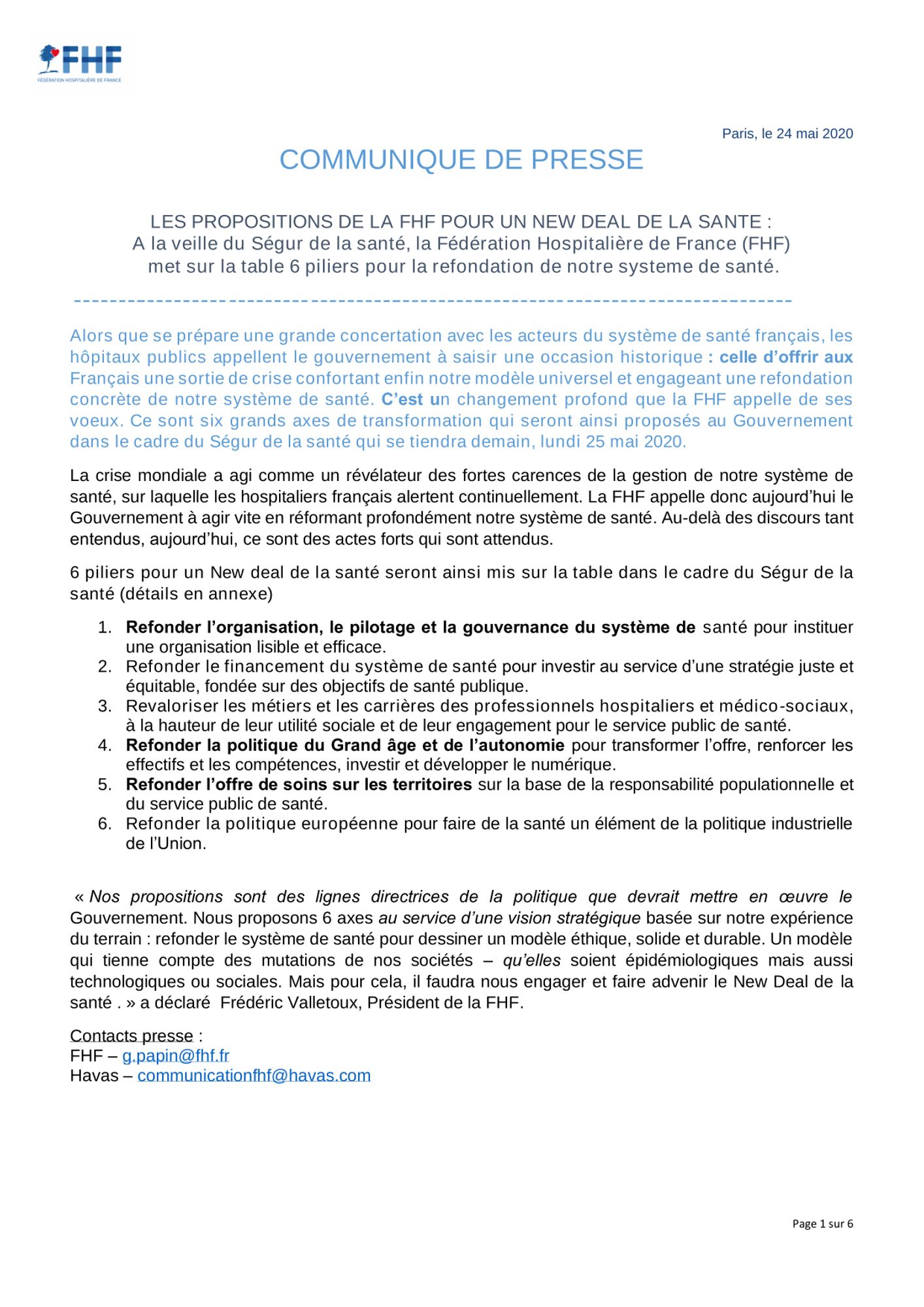À la veille du Ségur de la santé, la Fédération Hospitalière de France (FHF) met sur la table 6 piliers pour la refondation de notre système de santé.