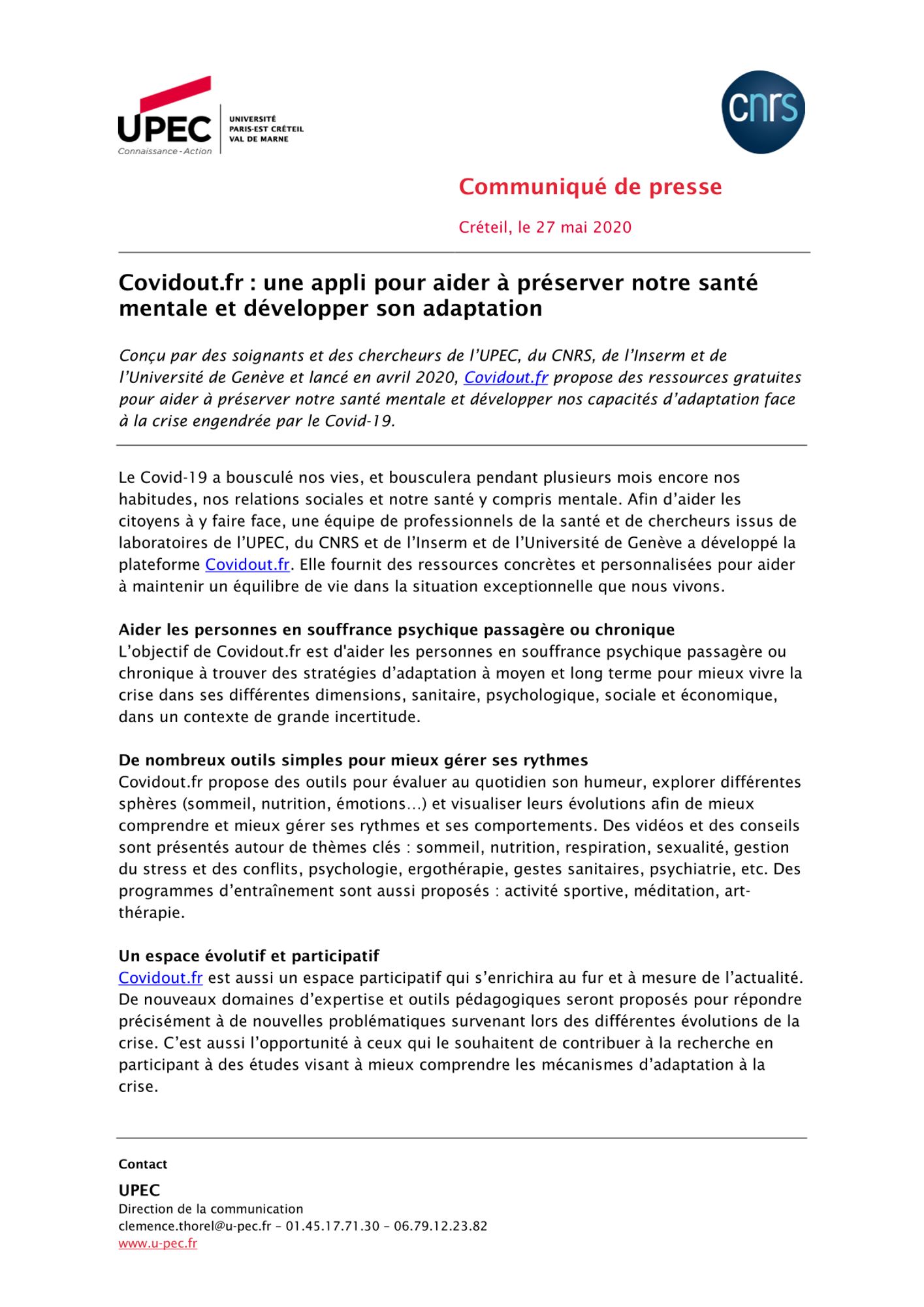 Conçu par des soignants et des chercheurs de l’UPEC, du CNRS, de l’Inserm et de l’Université de Genève et lancé en avril 2020, Covidout.fr propose des ressources gratuites pour aider à préserver sa santé mentale et développer ses capacités d’adaptation face à la crise engendrée par le Covid-19.
