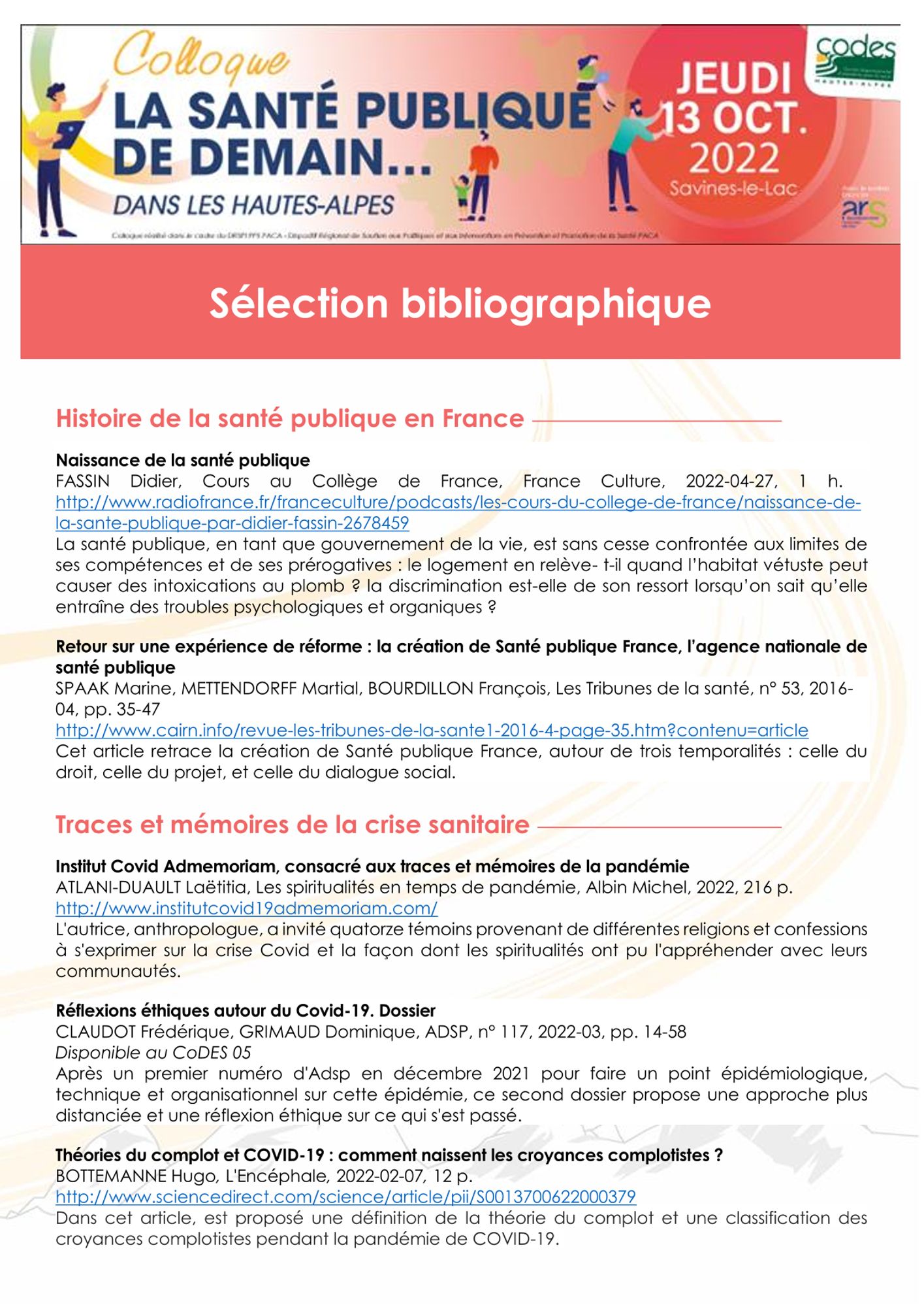 Les supports de présentation des intervenants, les actes, ainsi que la sélection bibliographique réalisée par la Chargée de documentation du CoDES 05 de ce colloque sont accessibles sur cette page.
