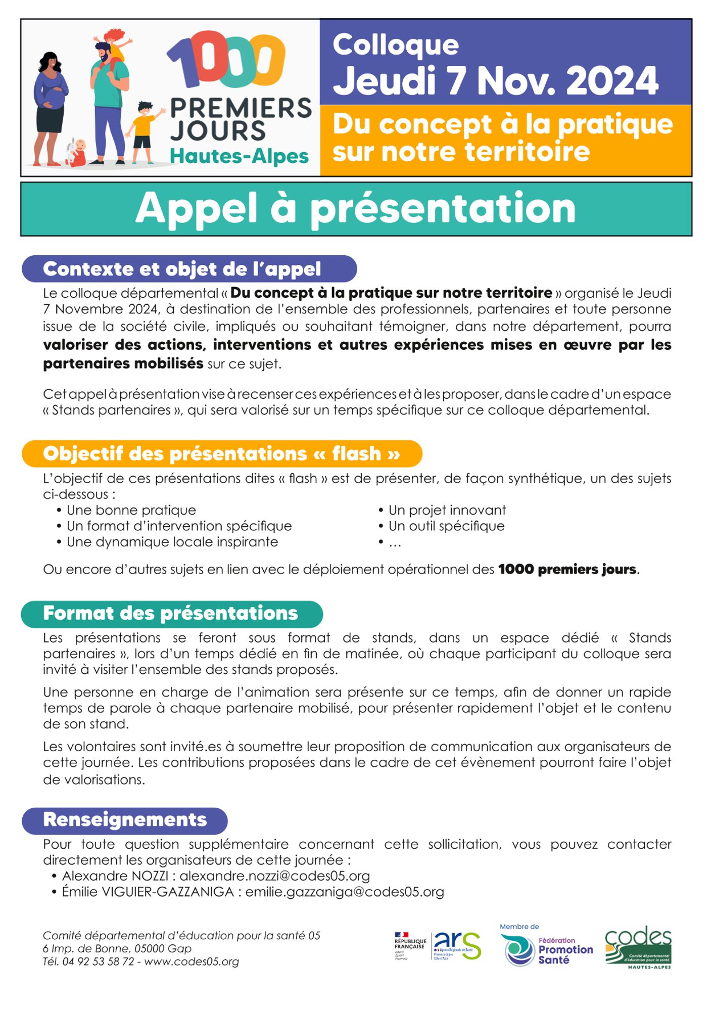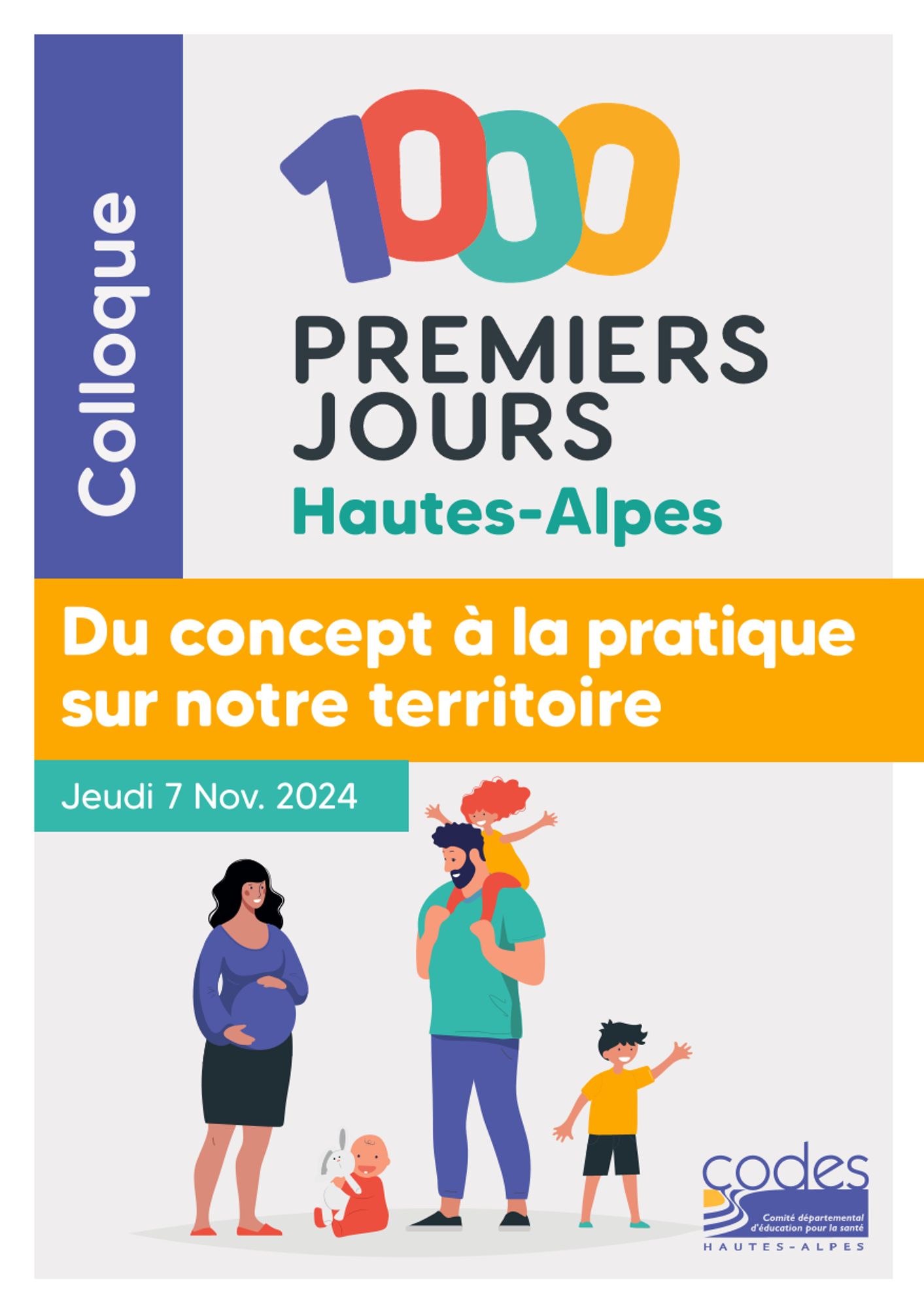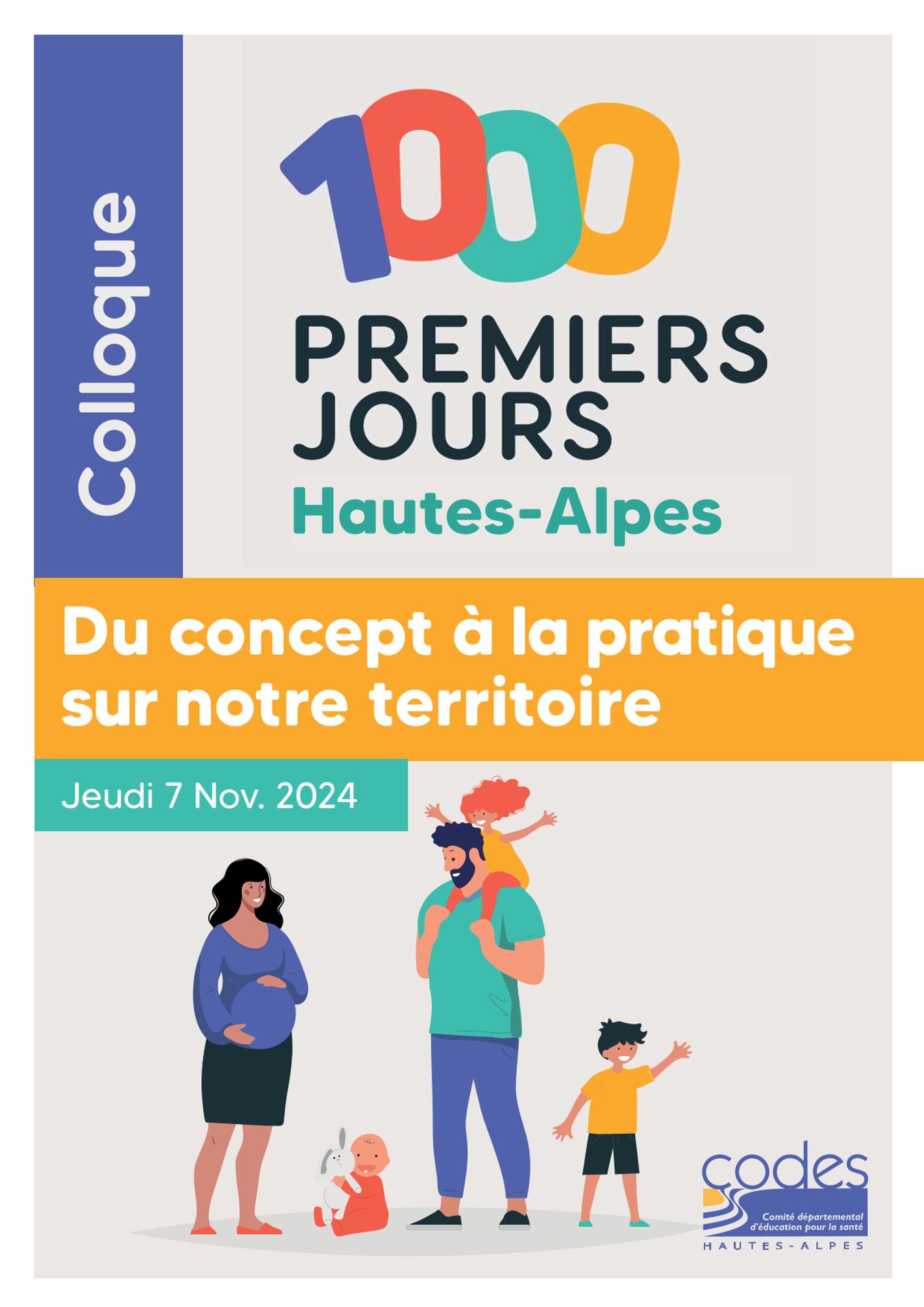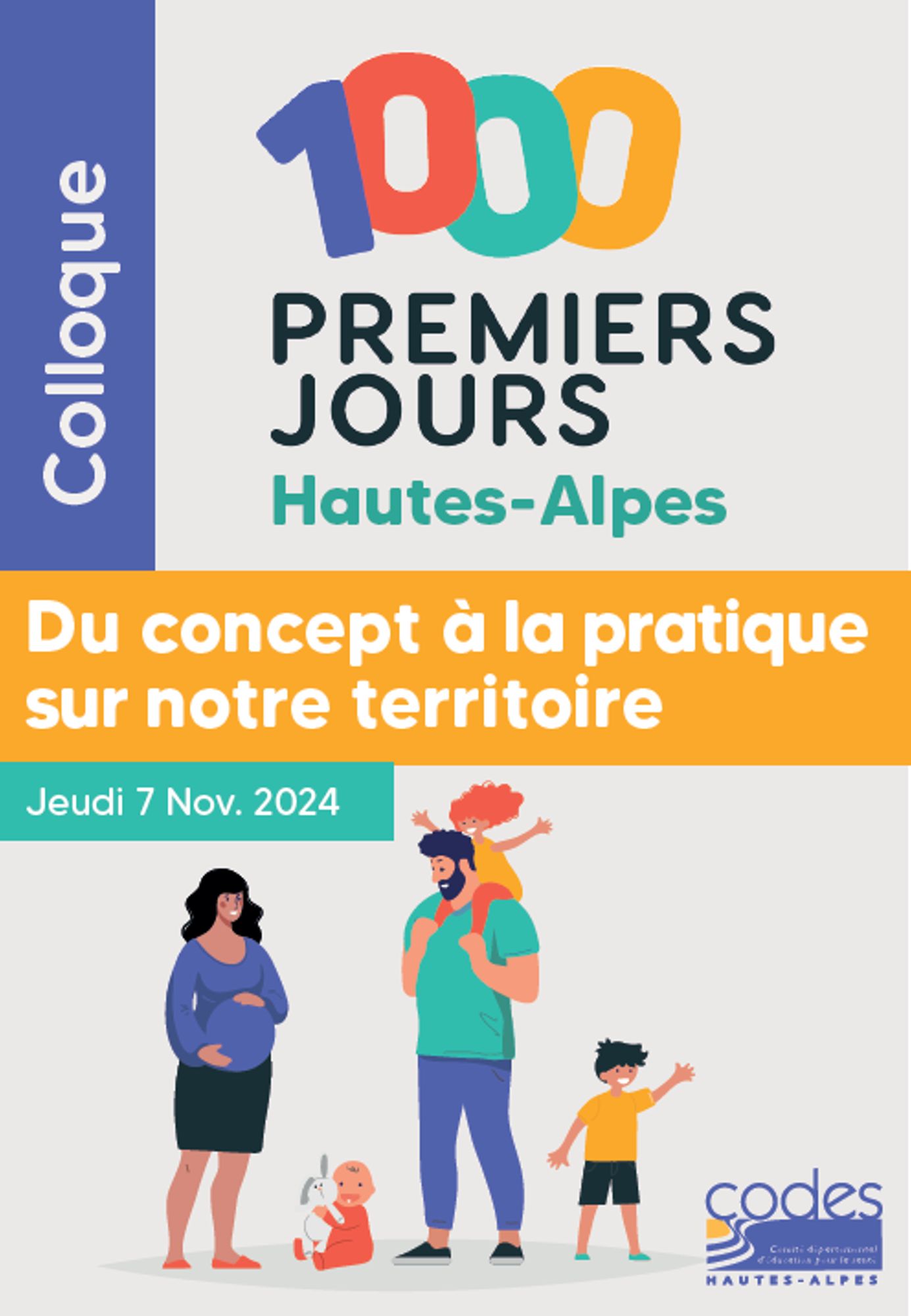Le CoDES 05 organise, avec le soutien de l'Agence Régionale de Santé PACA, et de ses partenaires locaux mobilisés, son prochain colloque départemental « Les 1000 premiers jours... Du concept à la pratique sur notre territoire ! », à destination de l’ensemble des professionnels, partenaires et toute personne issue de la société civile, impliqués ou souhaitant témoigner, dans notre département :