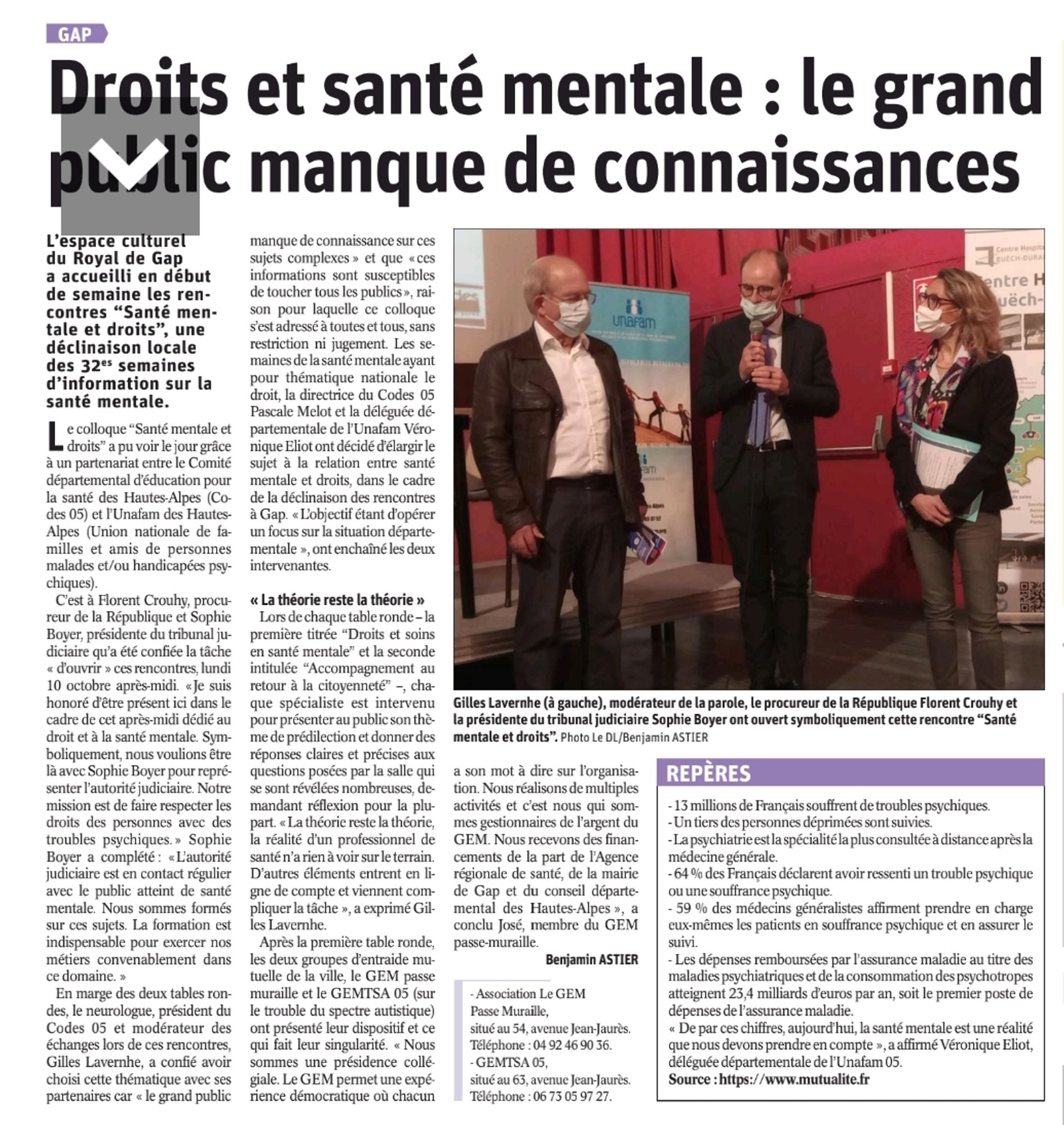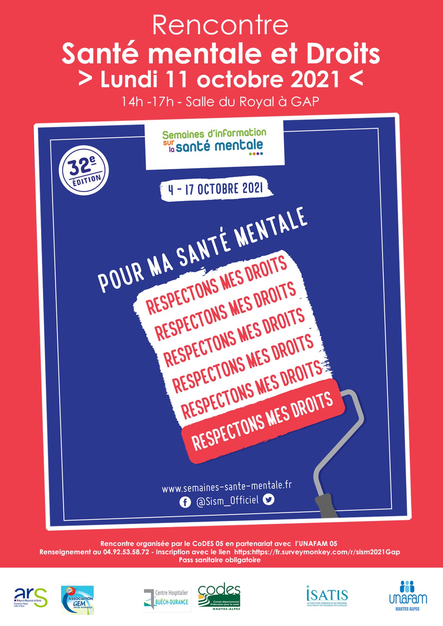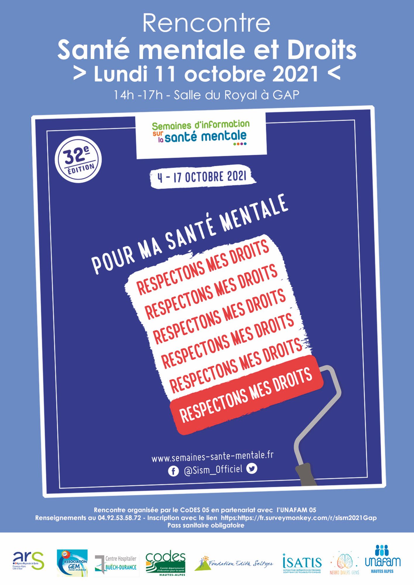 Une rencontre sur le thème : « Santé mentale et droits » s'est tenue le Lundi 11 Octobre 2021 de 14h à 16h30 puis de 17h à 19h