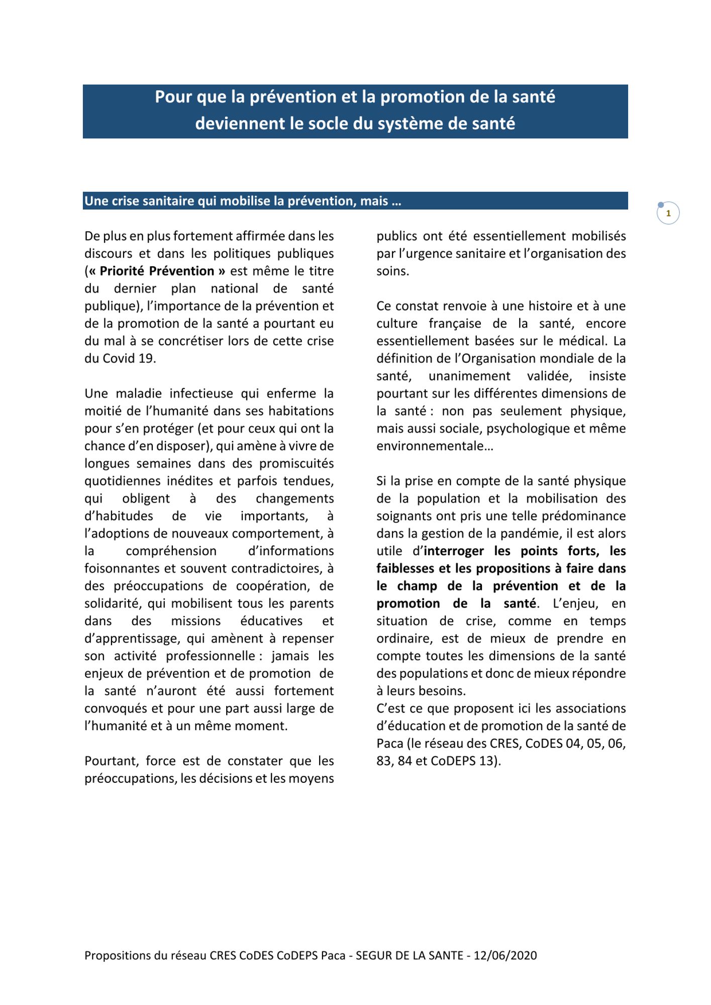 Nous vous invitons à lire les propositions du réseau CRES CoDES CoDEPS Paca pour le SEGUR de la Santé :