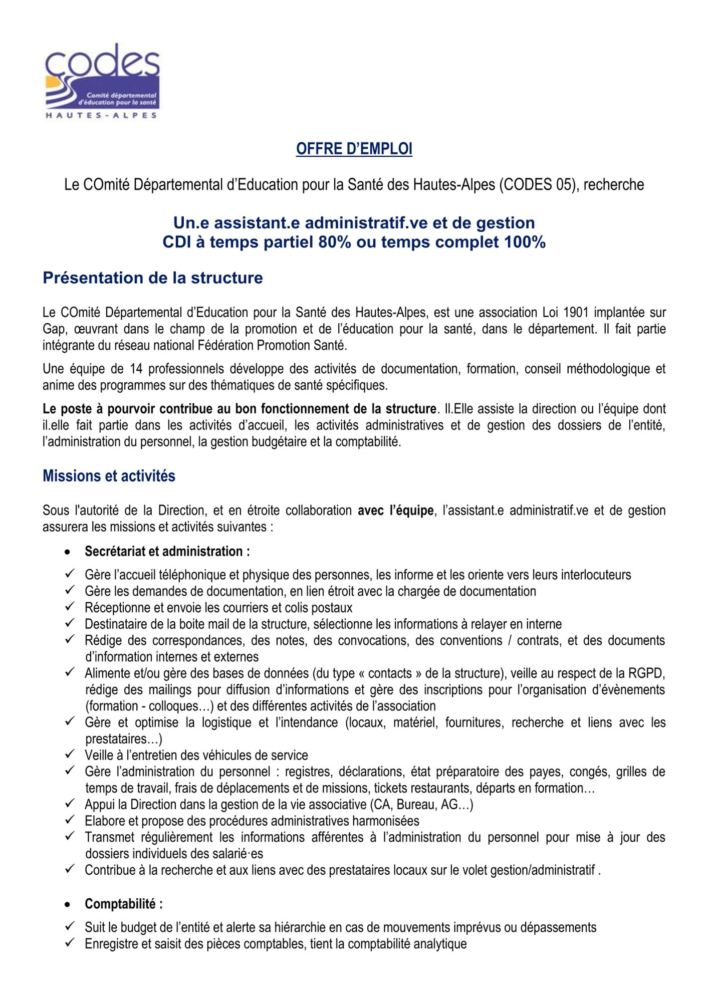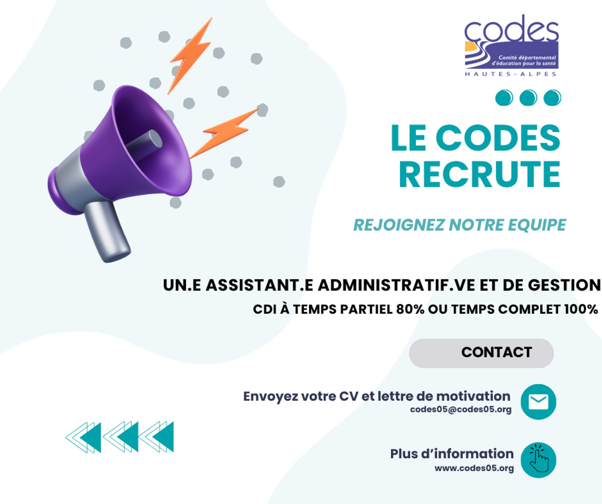 Le CoDES 05 recrute un.e assistant.e administratif.ve et de gestion CDI à temps partiel 80% ou temps complet 100% qui assurera les missions et activités suivantes :