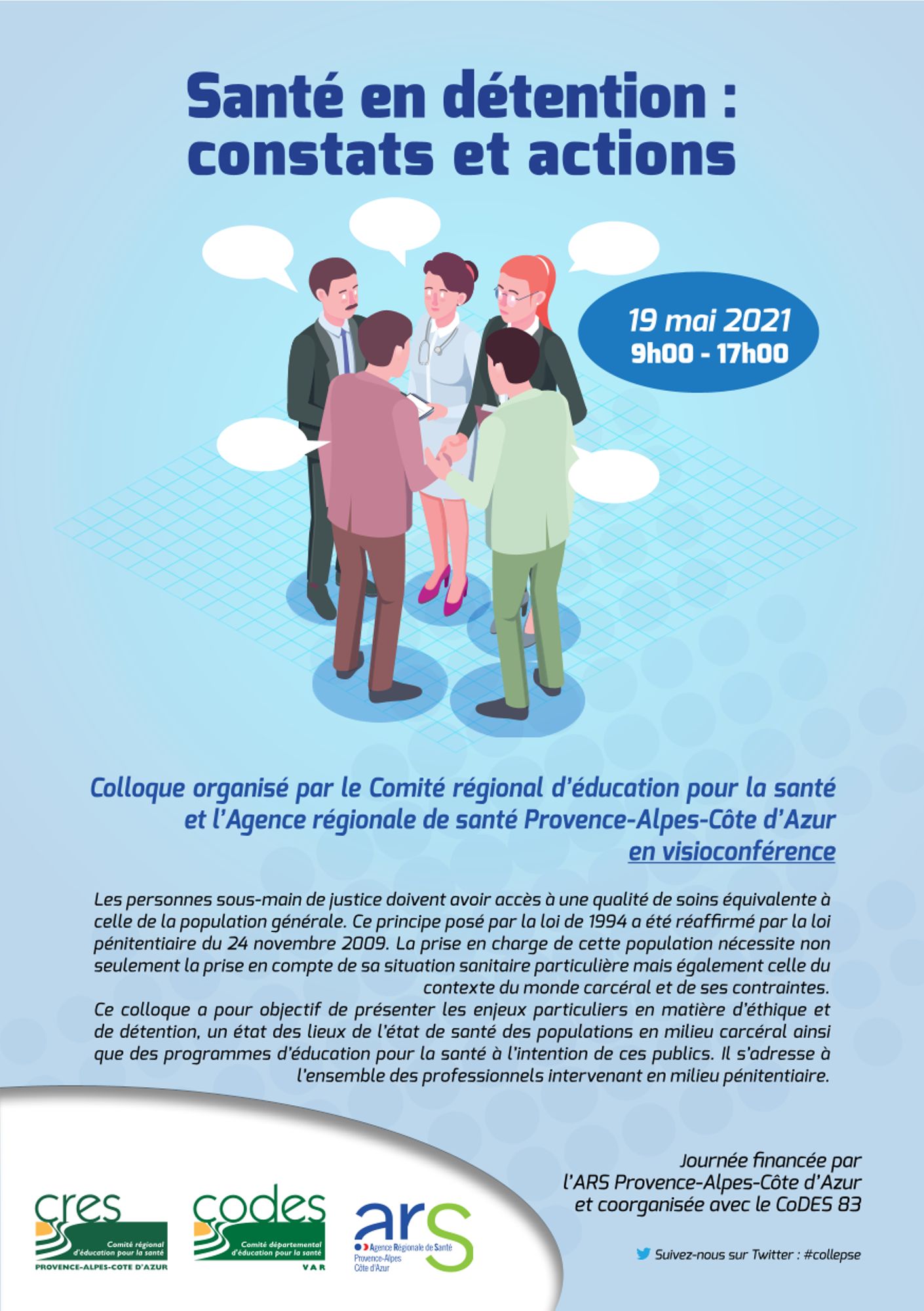 Le CRES organise le 19 mai 2021 un colloque régional "Santé en détention : constats et actions", en partenariat avec le CoDES du Var et l'ARS Provence-Alpes-Côte d’Azur, en visioconférence, de 9h à 17h.