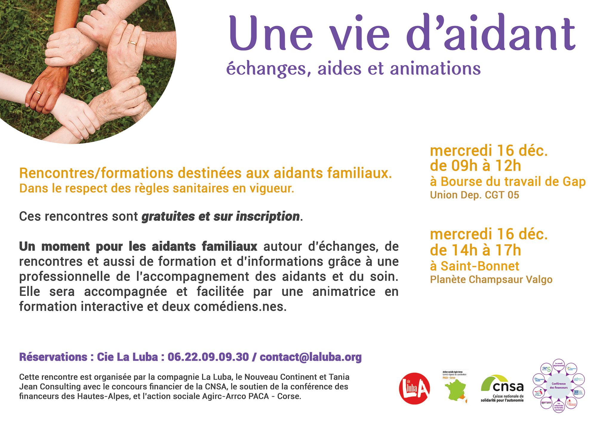 Une vie d'aidant Le 16 décembre à Gap et St Bonnet Rencontres/formations destinées aux aidants familiaux. Sur inscription auprès de La Luba : 06 22 09 09 30 / contact@laluba.org
