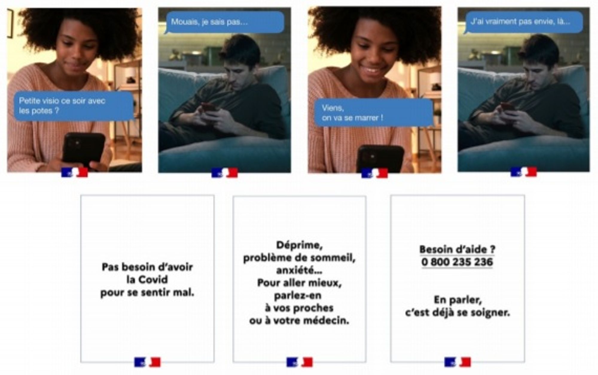 C’est sur le message « En parler, c’est déjà se soigner » que se concluent l’ensemble des messages : le ton est bienveillant et invite à parler à son entourage ou à son professionnel de santé. Il rappelle également l’existence du numéro vert 0 800 130 000 et du site Psycom.org