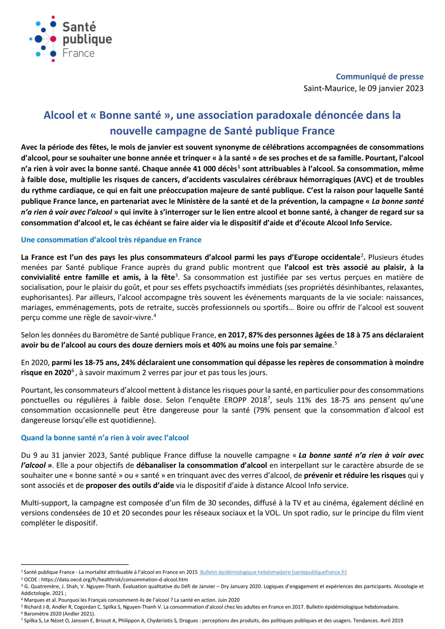 Du 9 au 31 janvier 2023, Santé publique France diffuse la nouvelle campagne « La bonne santé n’a rien à voir avec l’alcool ». Elle a pour objectifs de débanaliser la consommation d’alcool en interpellant sur le caractère absurde de se souhaiter une « bonne santé » ou « santé » en trinquant avec des verres d’alcool, de prévenir et réduire les risques qui y sont associés et de proposer des outils d’aide via le dispositif d’aide à distance Alcool Info service.
