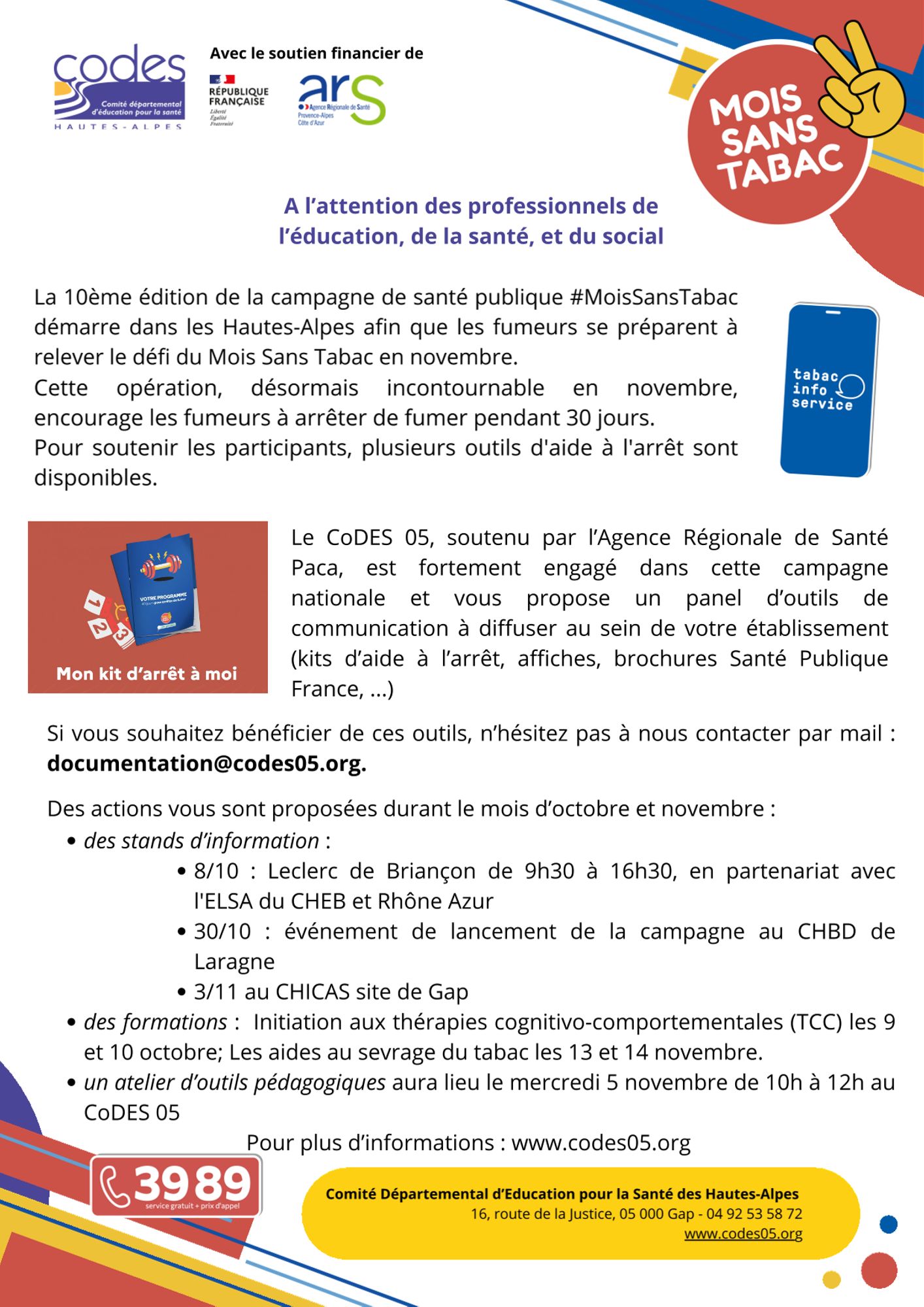Le CoDES 05, soutenu par l’Agence Régionale de Santé Paca, est fortement engagé dans cette campagne nationale et vous propose un panel d’outils de communication à diffuser au sein de votre établissement (kits d’aide à l’arrêt, affiches, brochures Santé Publique France...)