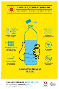 - Cette affiche illustrée par des pictos, rappelle la conduite à tenir en cas de canicule (boire de l'eau, mouiller son corps et se ventiler, maintenir sa maison au frais en fermant les volets, donner de ses nouvelles et prendre des nouvelles de ses proches, ne pas boire d'alcool, éviter les efforts physiques, manger en quantité suffisante). Elle indique le numéro de téléphone mis en place par le ministère de la Santé à compter du 1er juin de chaque année. Elle s'adresse à tous (mal voyants, personnes âgées, sourds-muets, etc.).