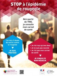 - Cette affiche incite à se faire vacciner contre la rougeole. Elle s'adresse aux personnes nées à partir de 1980 pour leur conseiller de consulter leur carnet de santé afin de vérifier s'ils ont reçu une ou deux doses de vaccin, et s'ils n'en ont reçu qu'une, elle les invite à consulter leur médecin.