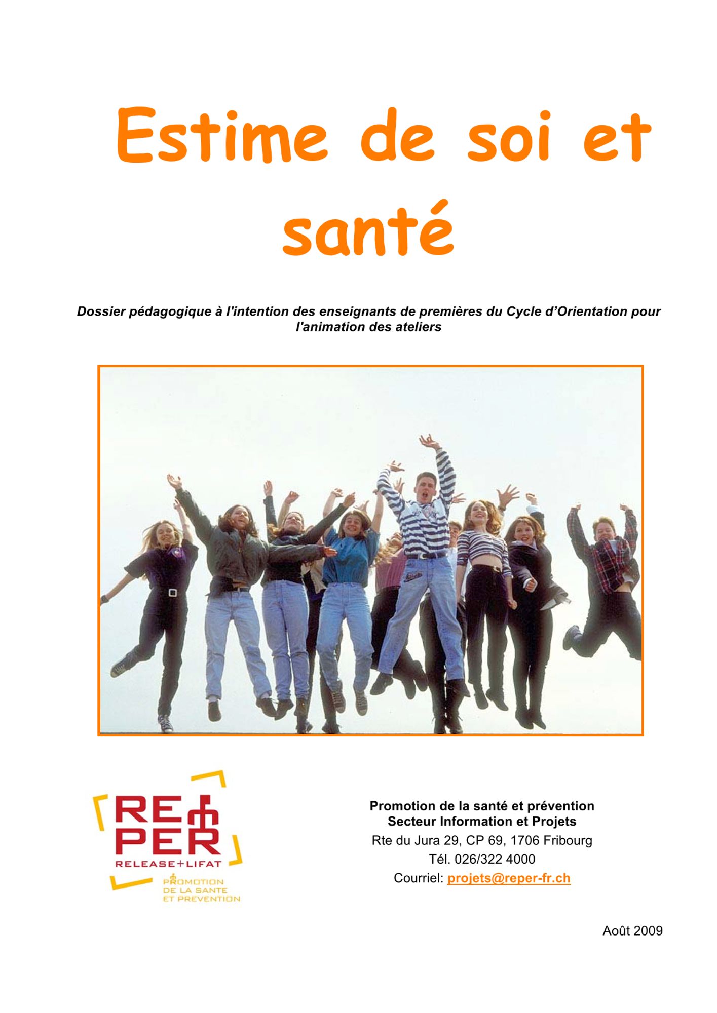 Ce dossier pédagogique a pour objectif de renforcer l'estime de soi de chaque élève afin d'augmenter les facteurs de protection face aux divers problèmes de la vie. La première partie du document présente le but global, les objectifs à travailler et rappelle quelques repères théoriques. La deuxième partie propose une vingtaine d’activités prêtes à l’emploi pour les classes, divisées en 3 chapitres: la santé, l’estime de soi et l’affirmation de soi. En fin de document se trouvent une bibliographie et quelques adresses utiles.